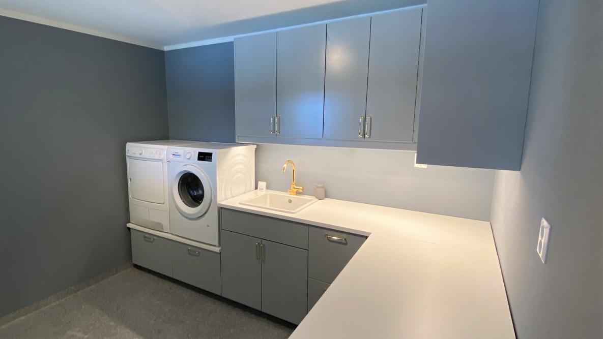 Et stort og romslig vaskerom med god plass til å henge opp klær.
