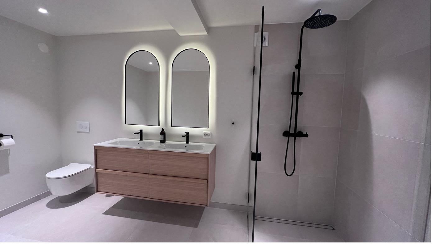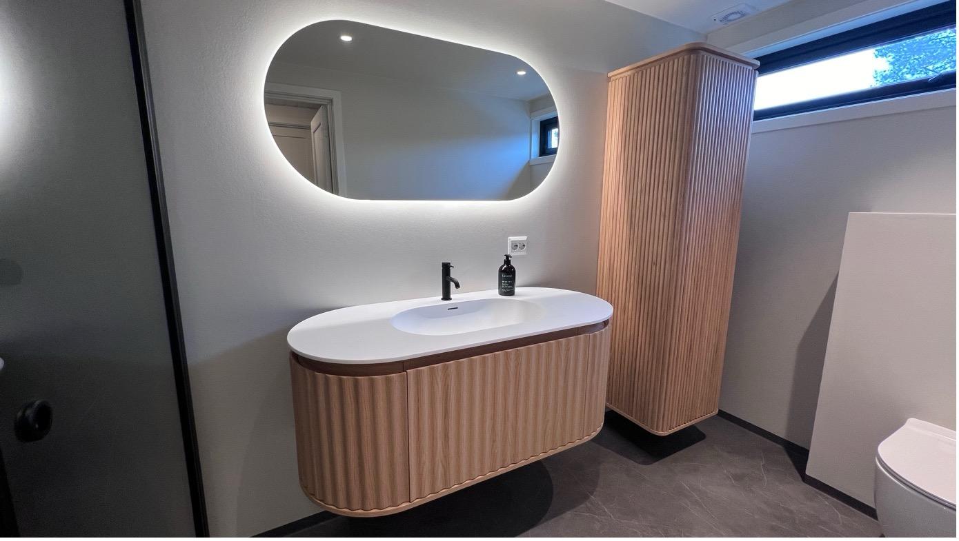 Her har kunden gått for buede speil med lys bak – en utrolig flott kontrast til de stramme linjene man ser ellers på badet.