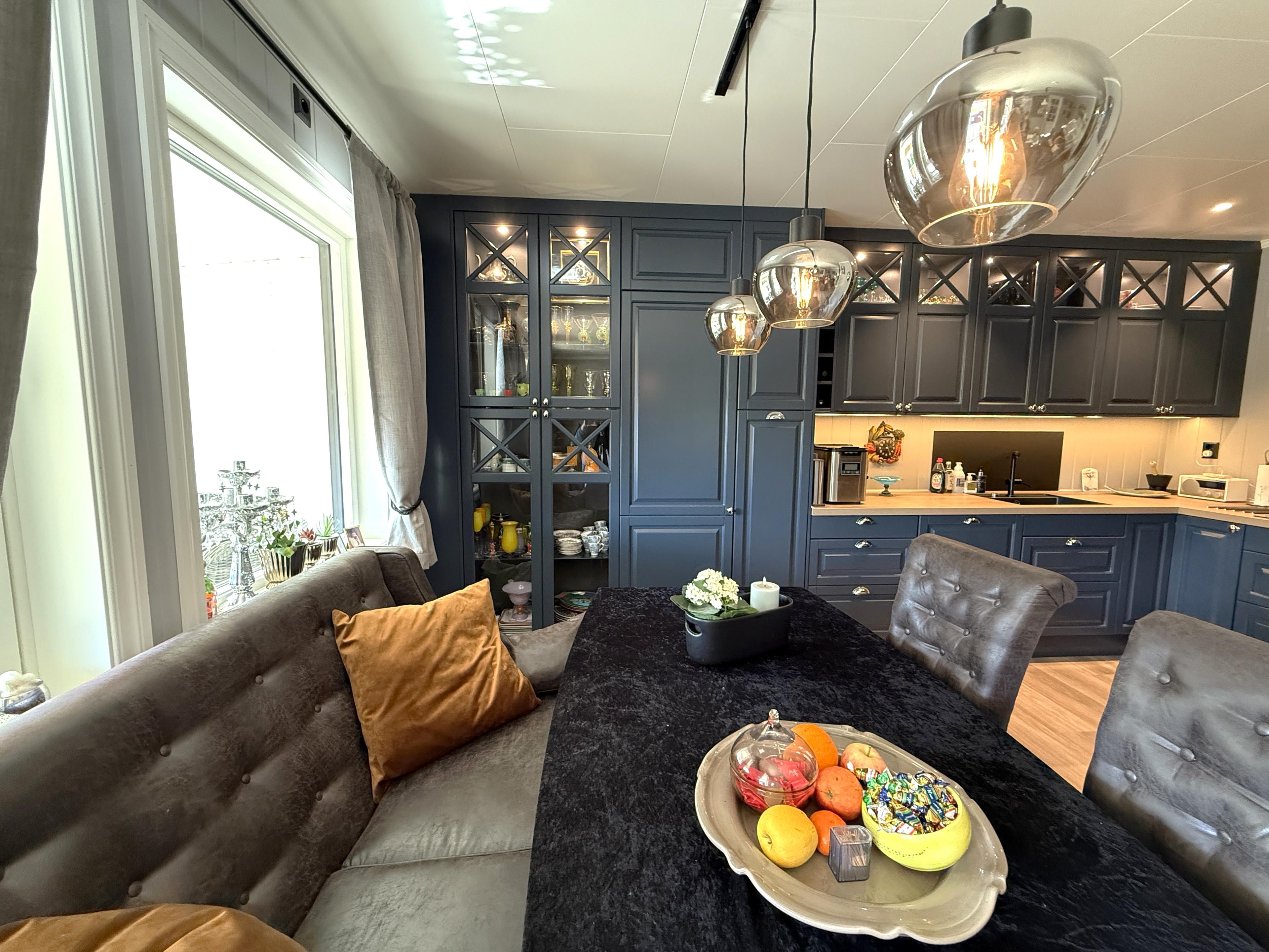 Leiligheten til Kari har en lun og elegant stil, med klassisk kjøkken i mørk blått og et spisestueområde som oser av sjarm. Møbler og kunst forteller en historie, og det er lett å kjenne seg hjemme her.