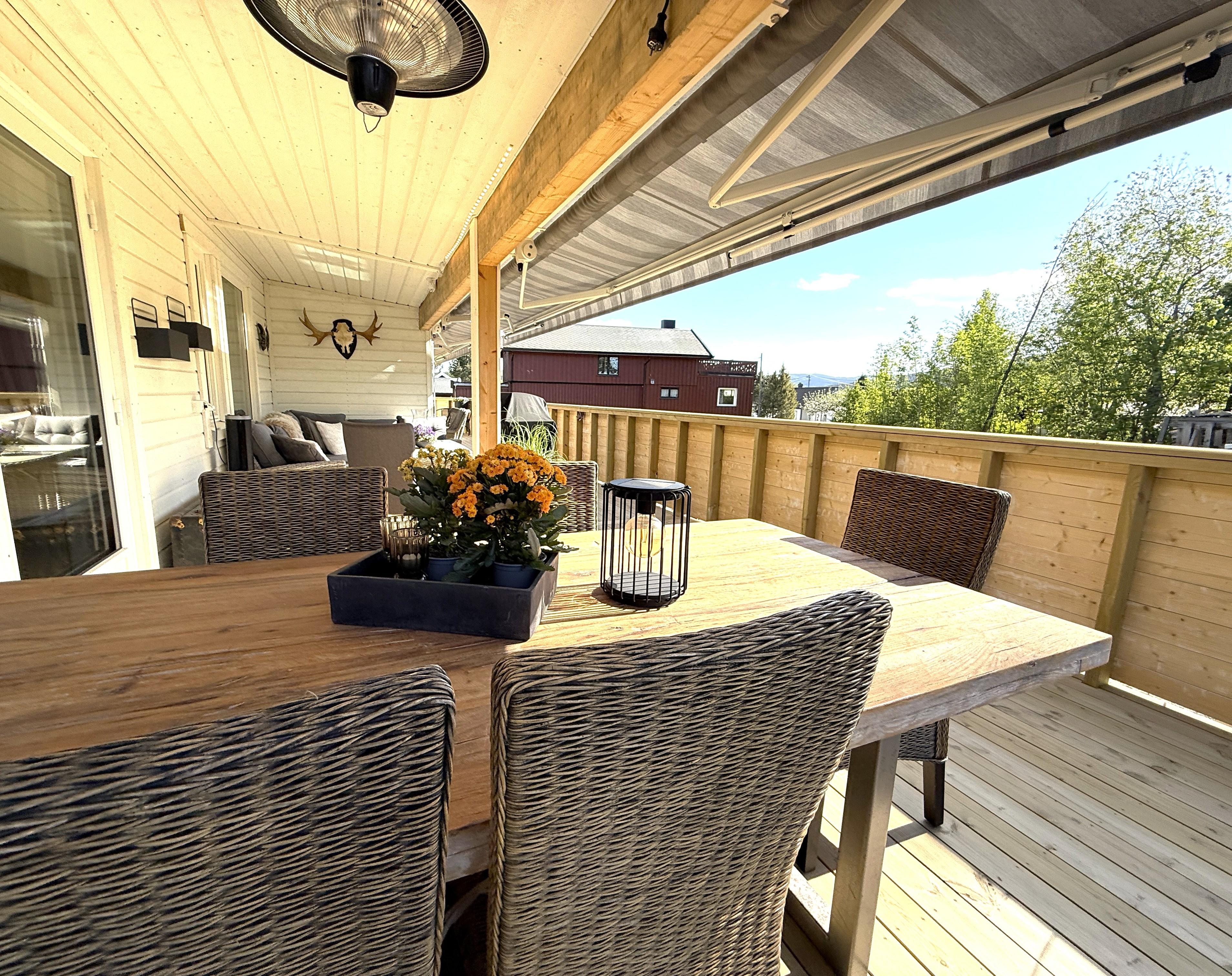 Bilder fra boligen viser lune farger, personlige detaljer og en smakfull miks av moderne og klassiske elementer. Den romslige terrassen er utvidet og delt med svigermor, noe som gir både fellesskap og fleksibilitet.
