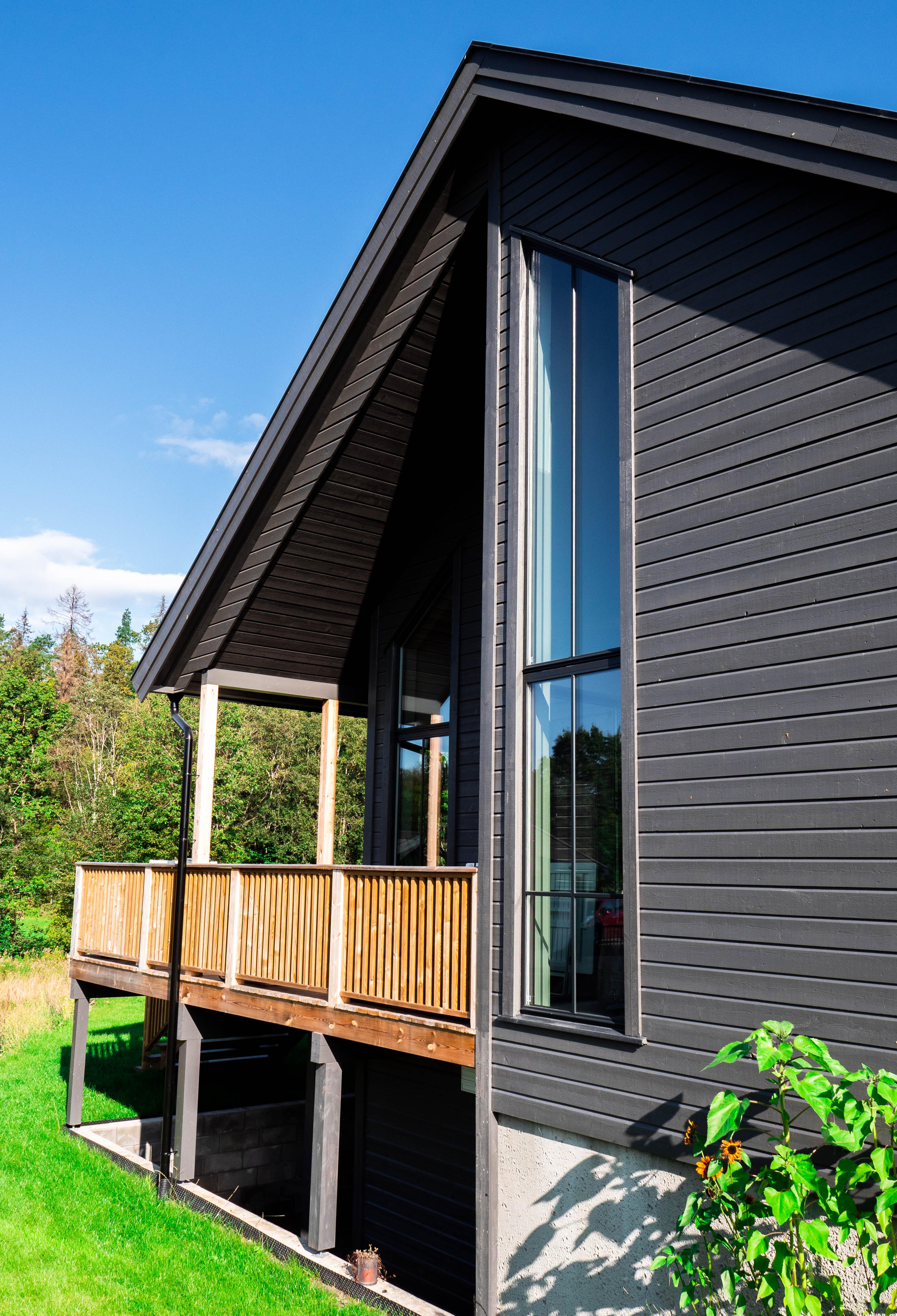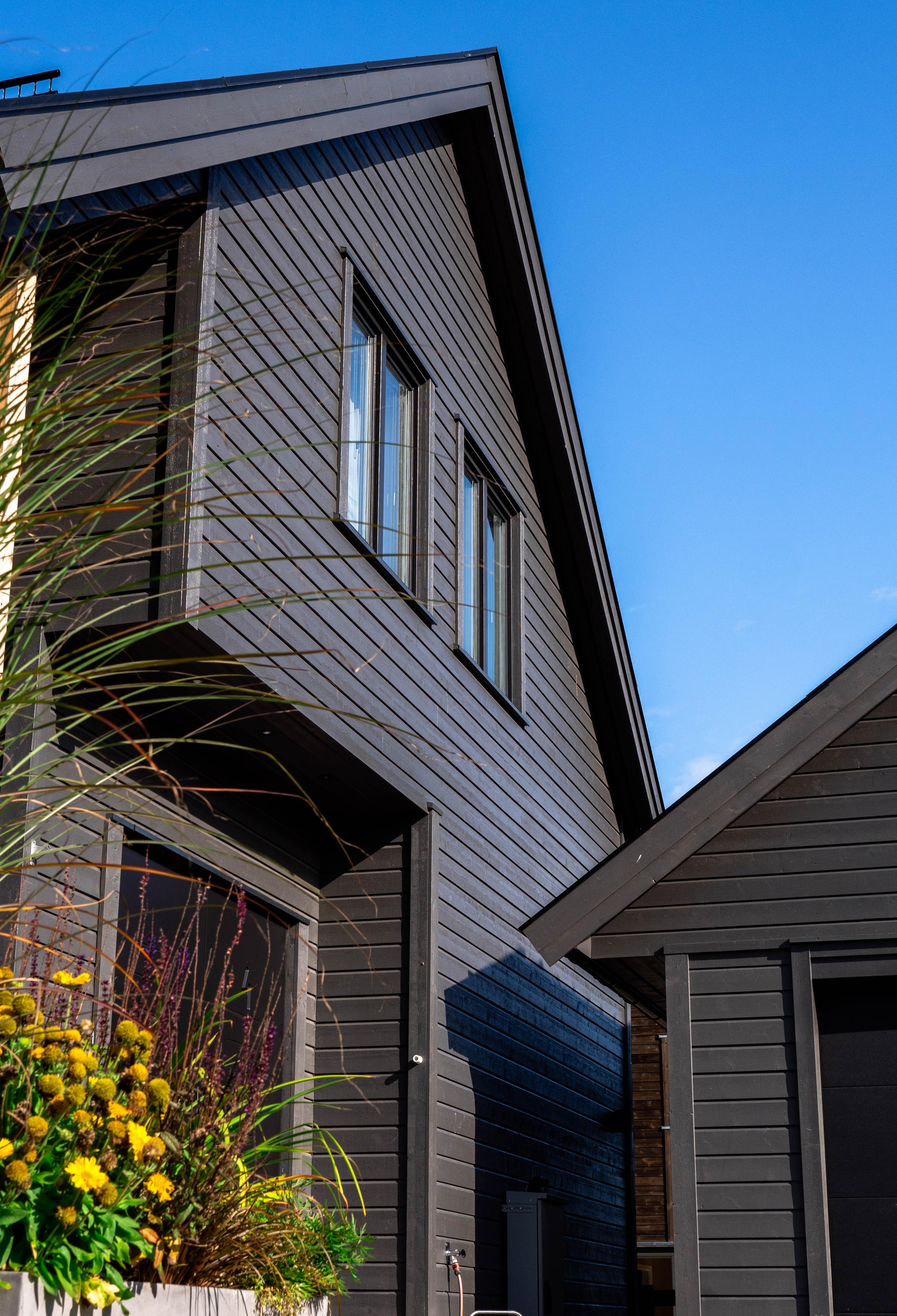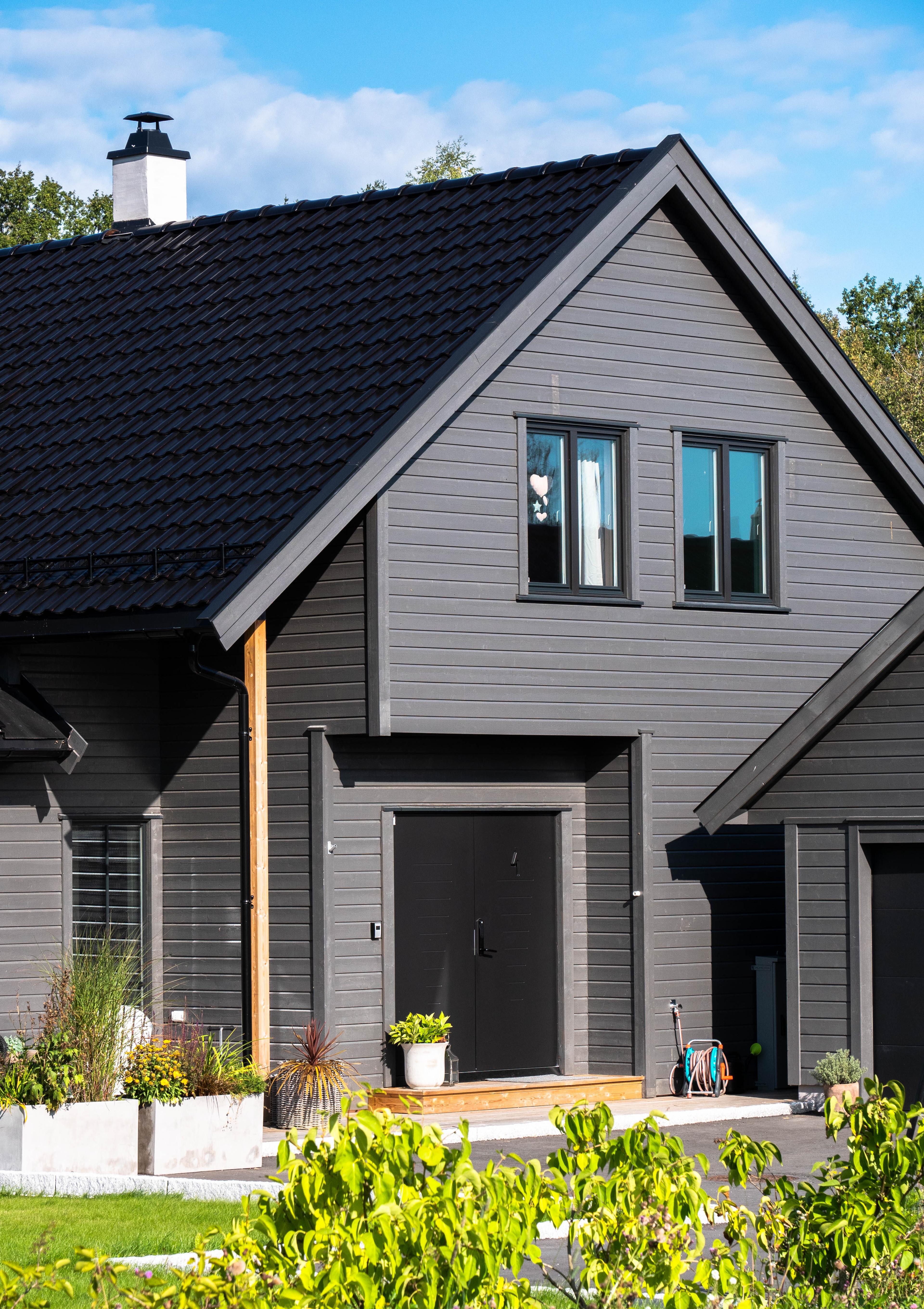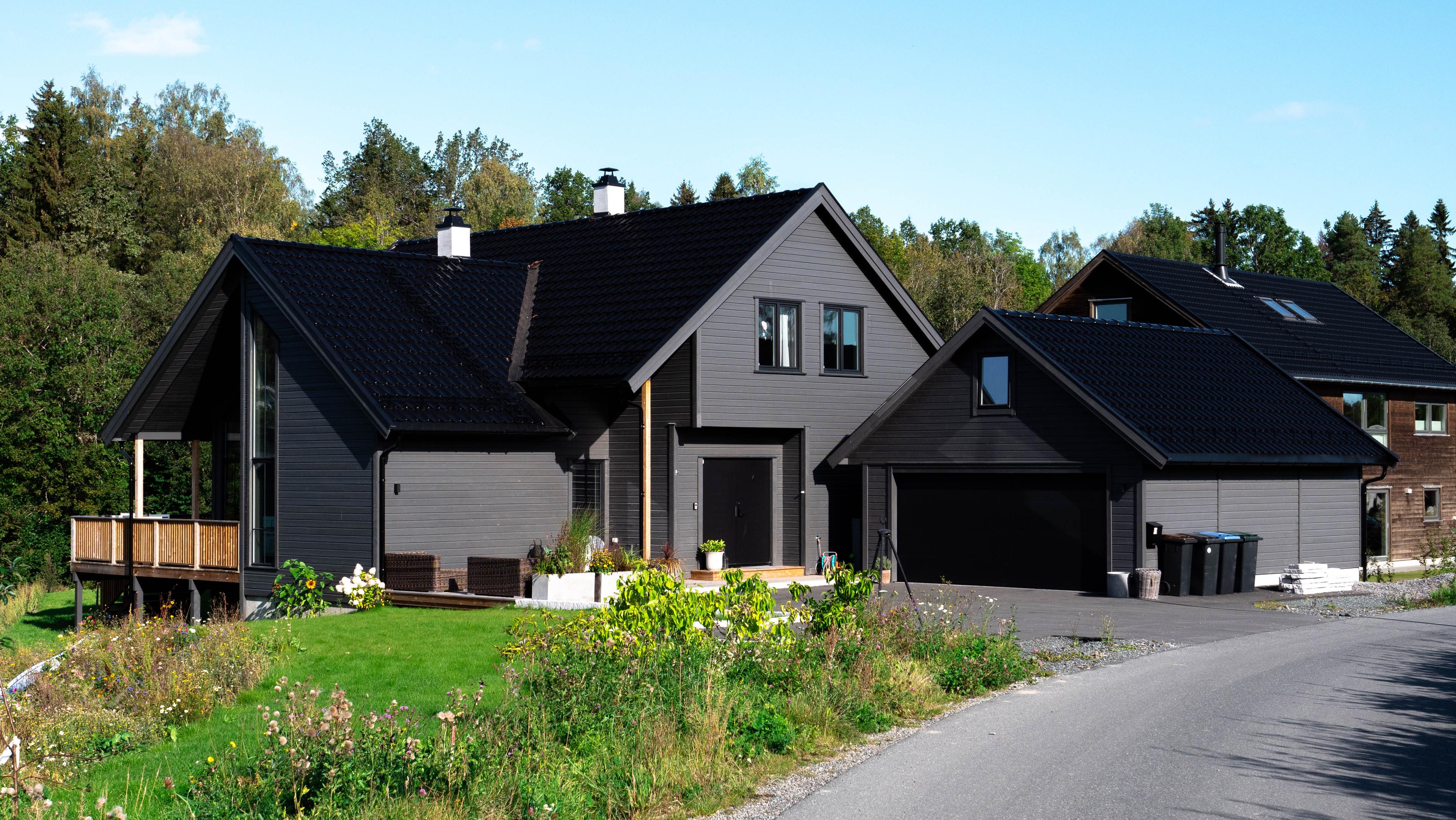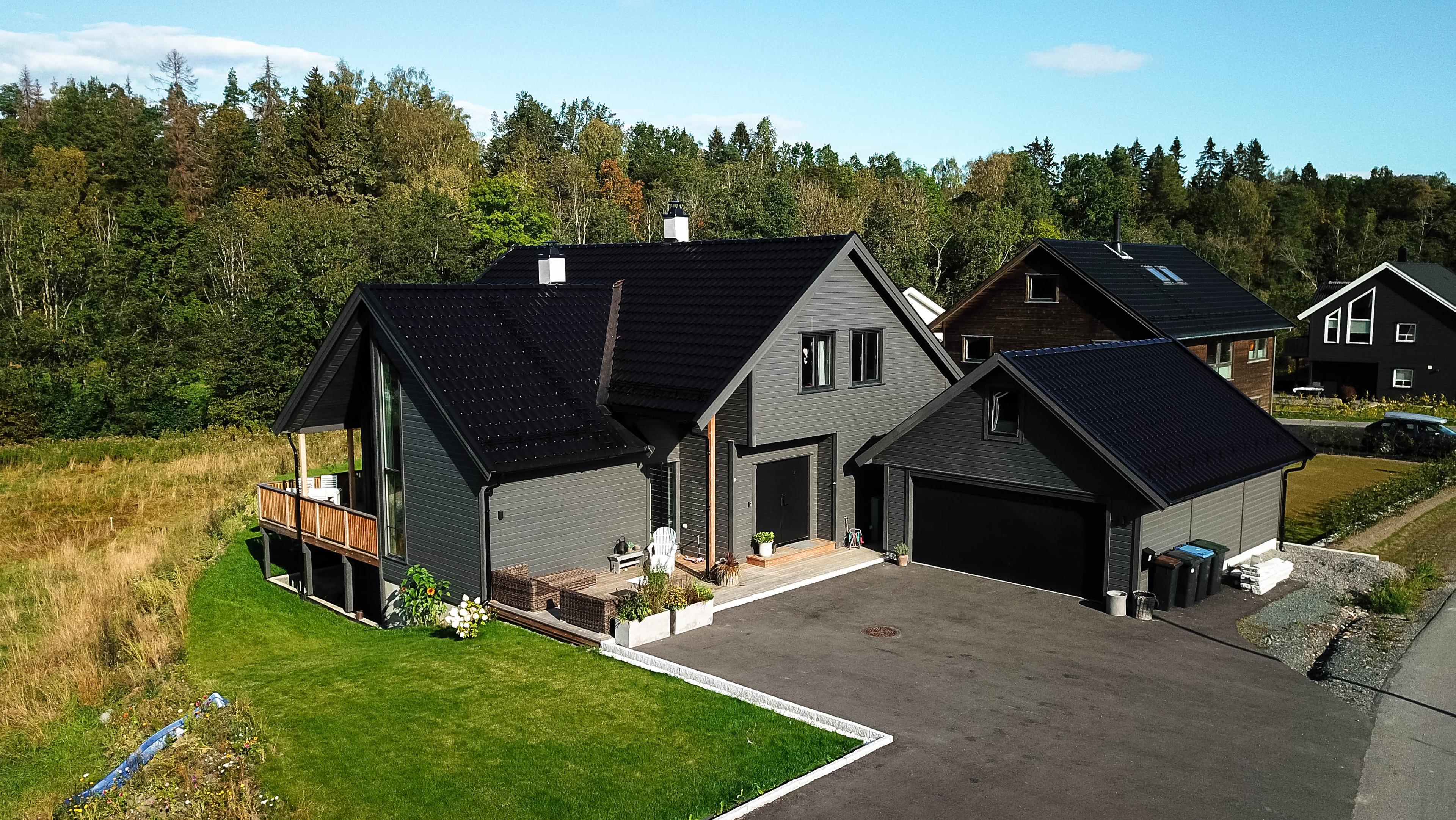 Oppdag dette storslåtte moderne huset i tradisjonell stil, som harmonisk kombinerer klassiske elementer med moderne komfort. Med svart takstein og detaljer, samt elegant grå kledning, gir boligen et tidløst preg som smelter inn i omgivelsene. Store vinduer slipper inn rikelig med lys, og skaper en lys og innbydende atmosfære innendørs.