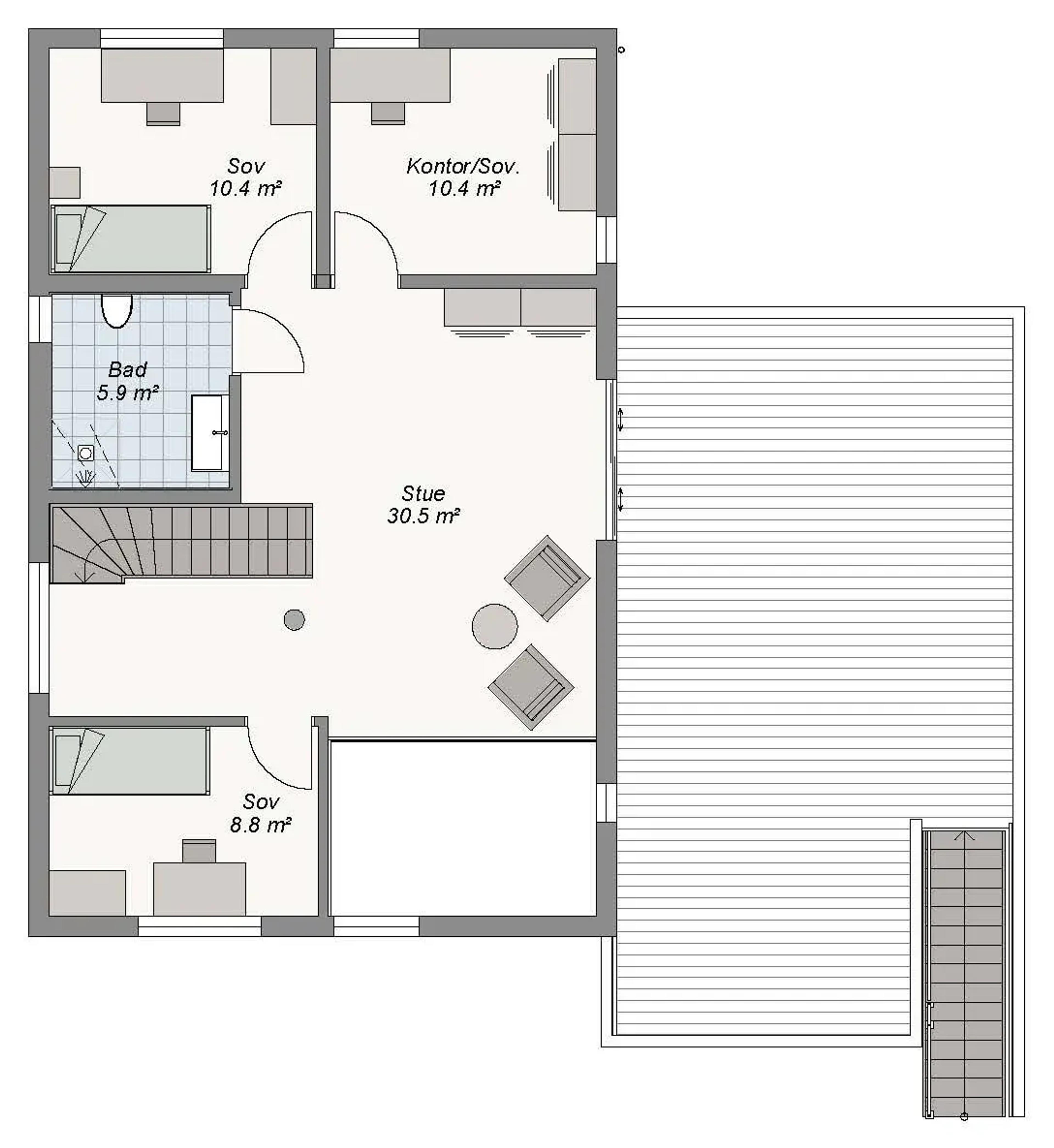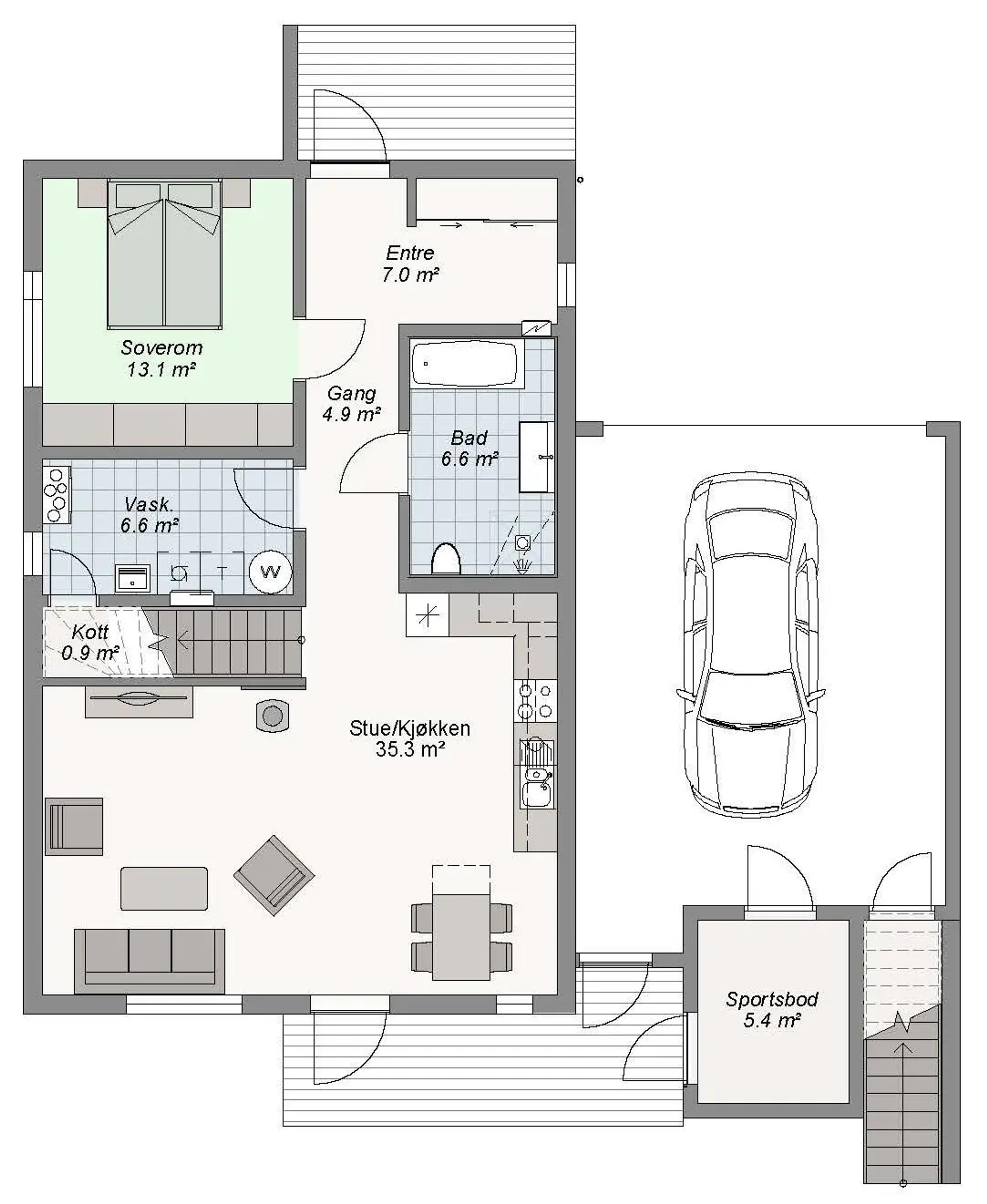 I tillegg til et estetisk tiltalende ytre, tilbyr Kosmo praktiske fordeler som egen carport og fine hageområder både foran og bak boligen. Den ekstra takhøyden gir mulighet for et hemsområde, et ideelt fristed for barna eller en ekstra overnattingsplass for gjester. Med Kosmo får du ikke bare et hjem, men en harmonisk oase hvor funksjonalitet og estetikk forenes på en unik måte.