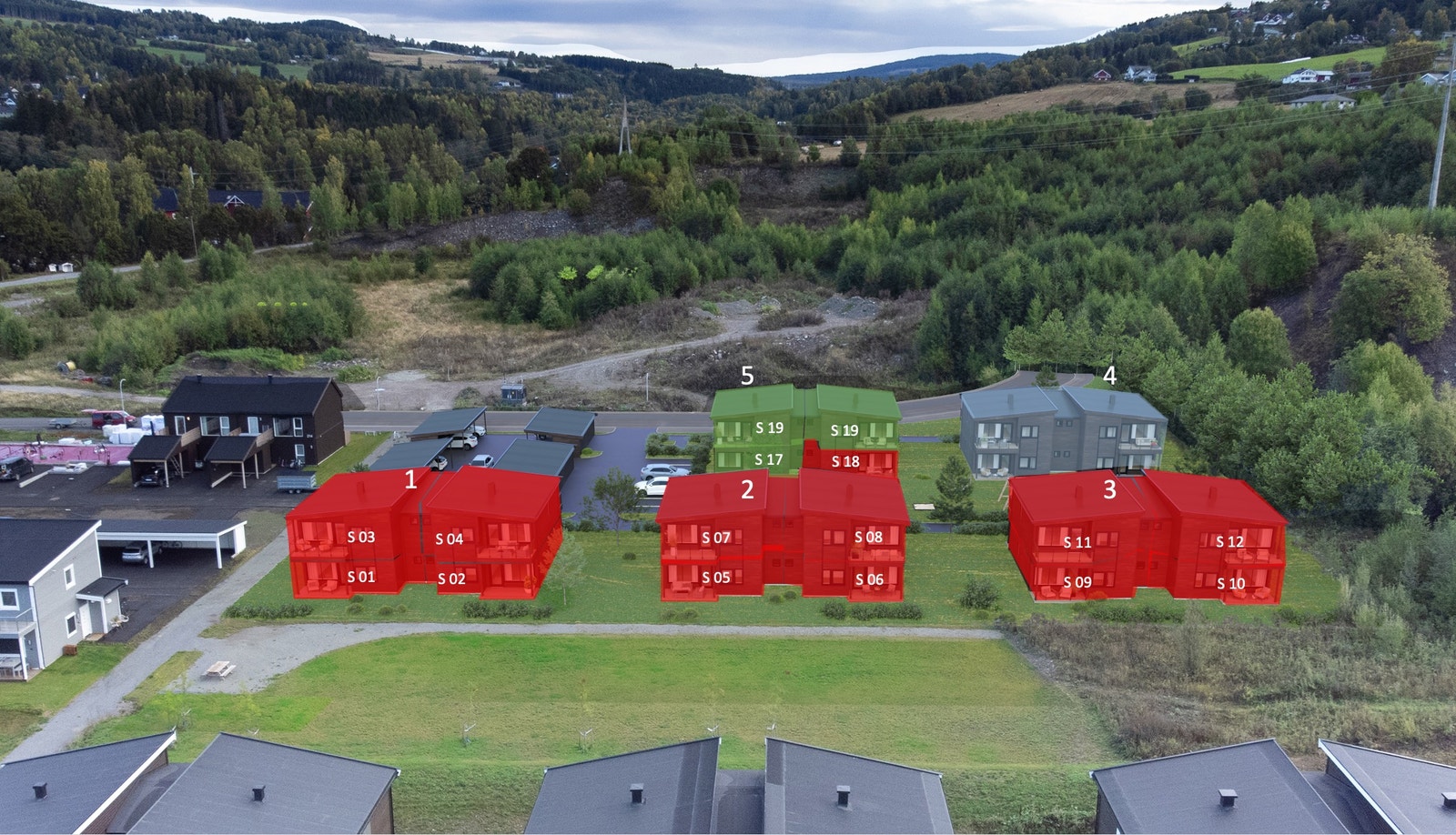 De tre første salgstrinnene gjelder Bygg 1, 2 , 3 og 4 som vist på utomhusplan og illustrasjoner under merket med grønn farge. Solgte boliger er markert med rødt.