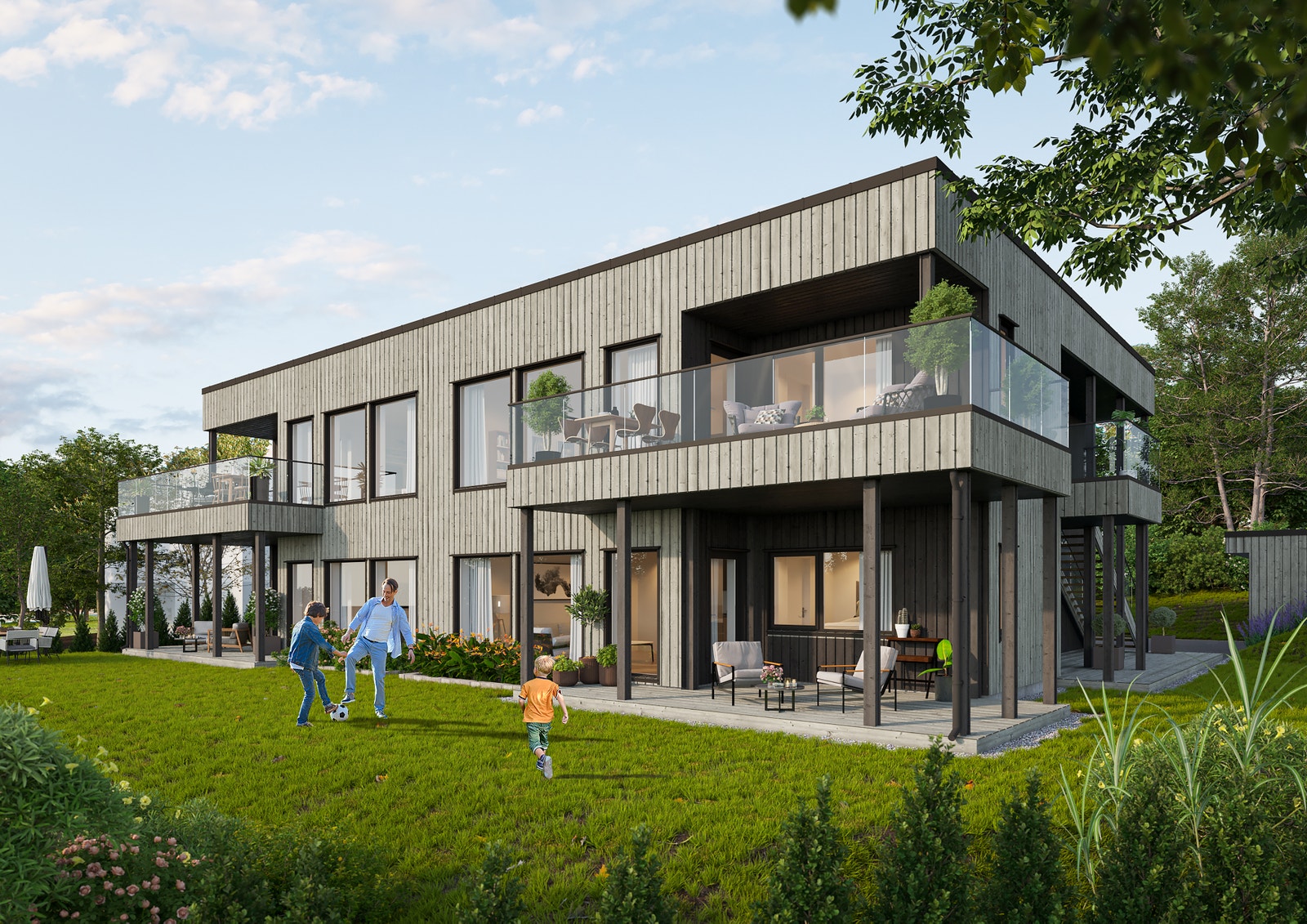 - Stor utvendig bod på 10 m² per enhet, som sikrer rikelig med lagringsplass.
