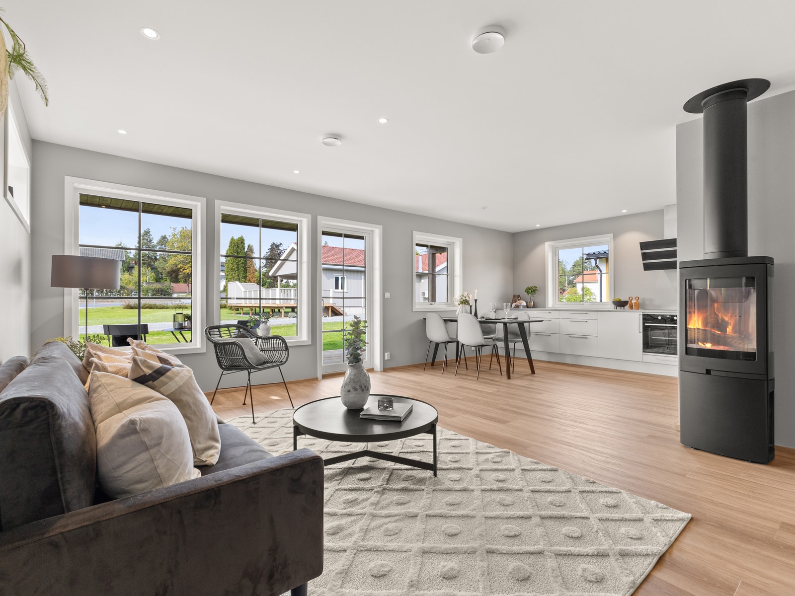 - Åpen løsning mellom stue og kjøkken gir en luftig og romslig følelse, og når døren til den overbygde terrassen er åpen så oppleves arealet enda større.