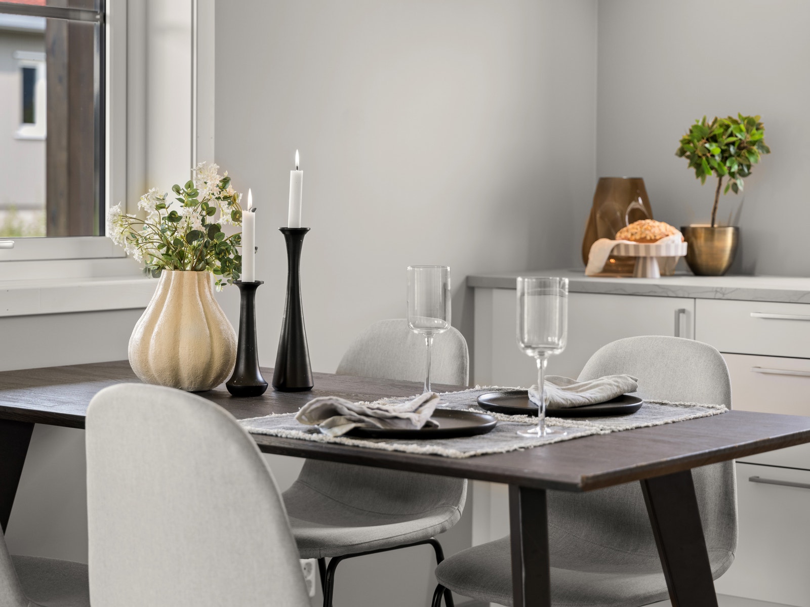 - Åpen løsning mellom stue og kjøkken gir en luftig og romslig følelse, og når døren til den overbygde terrassen er åpen så oppleves arealet enda større.
