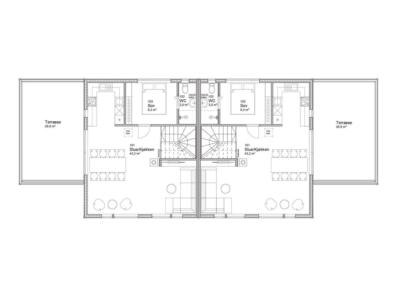 Tomannsboligen, pr. boenhet, består av stue/kjøkken, bod/vask, bad, WC med dusj og toalett, tre soverom og gang/trapp. Boligen har overbygget inngangsparti, integrert garasje med stor terrasse over og sportsbod.