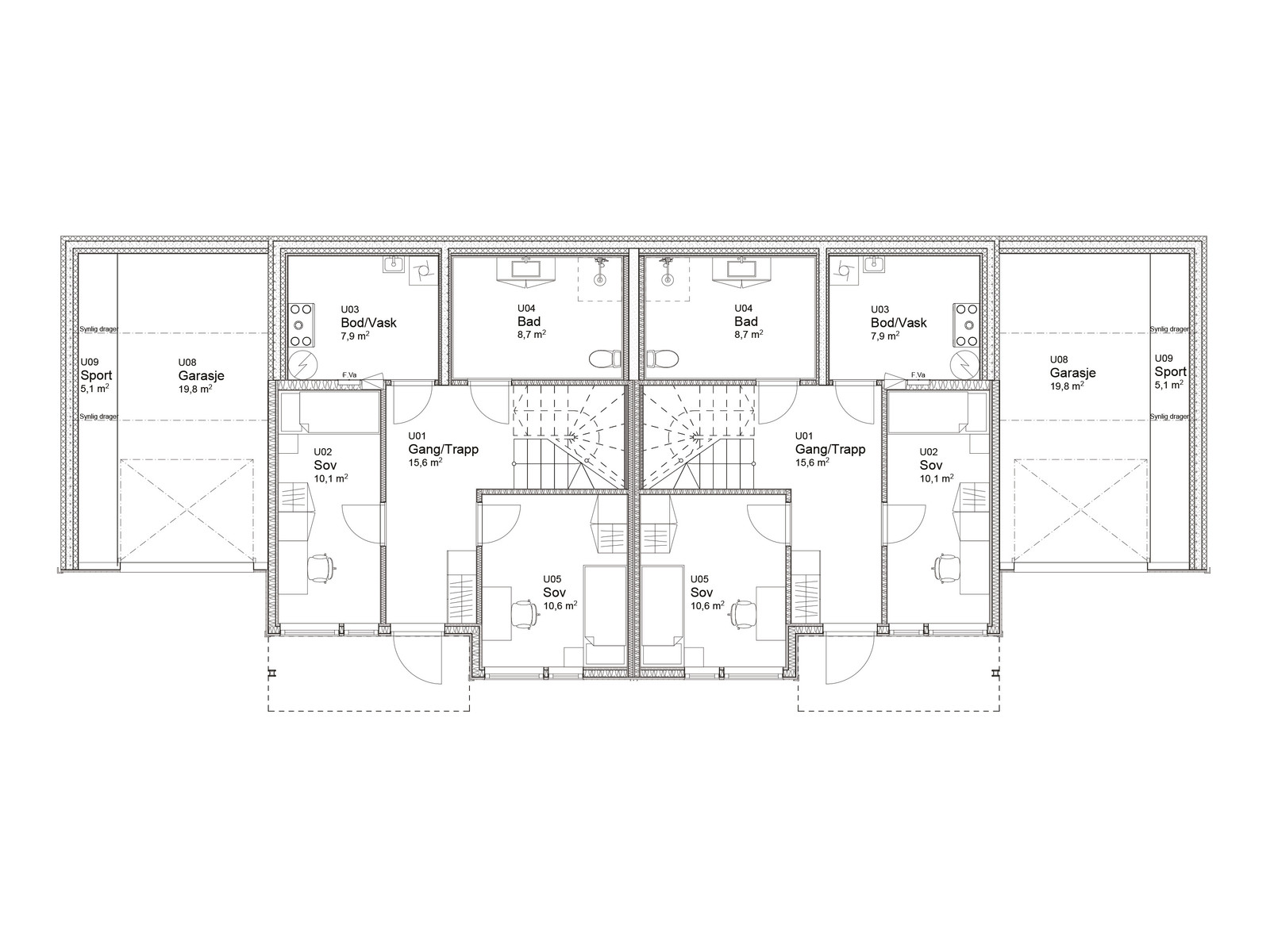 Tomannsboligen, pr. boenhet, består av stue/kjøkken, bod/vask, bad, WC med dusj og toalett, tre soverom og gang/trapp. Boligen har overbygget inngangsparti, integrert garasje med stor terrasse over og sportsbod.