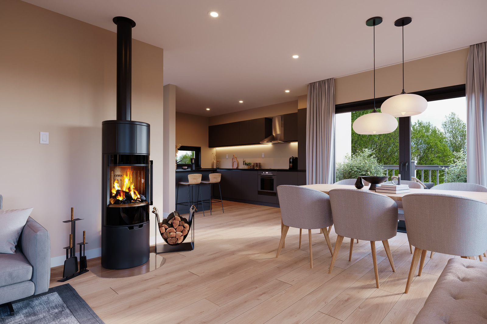 · Åpen løsning mellom stue og kjøkken. Dette skaper et lyst og sosialt samlingspunkt for familien og når du har gjester på besøk.