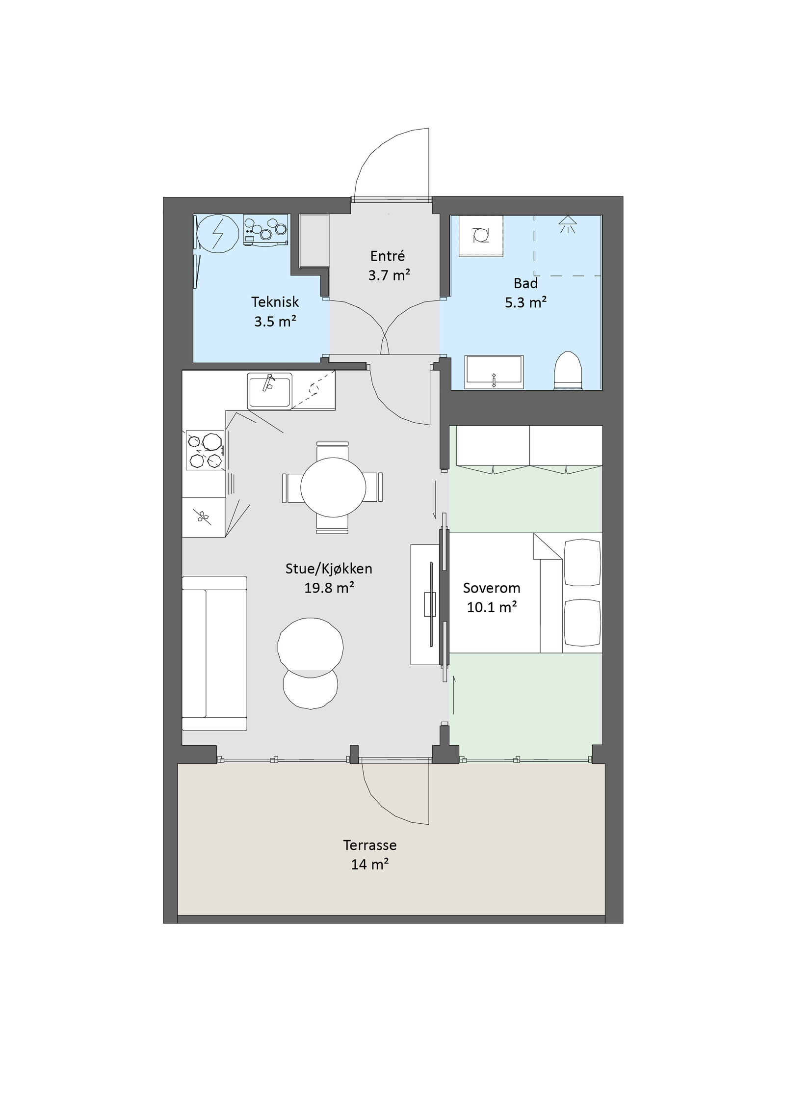 Du kan velge mellom leiligheter med 1 eller 3 soverom, tilpasset både enslige, par og små familier. Uansett størrelse får du lyse og romslige oppholdsrom, gode oppbevaringsmuligheter og egen uteplass eller balkong.
