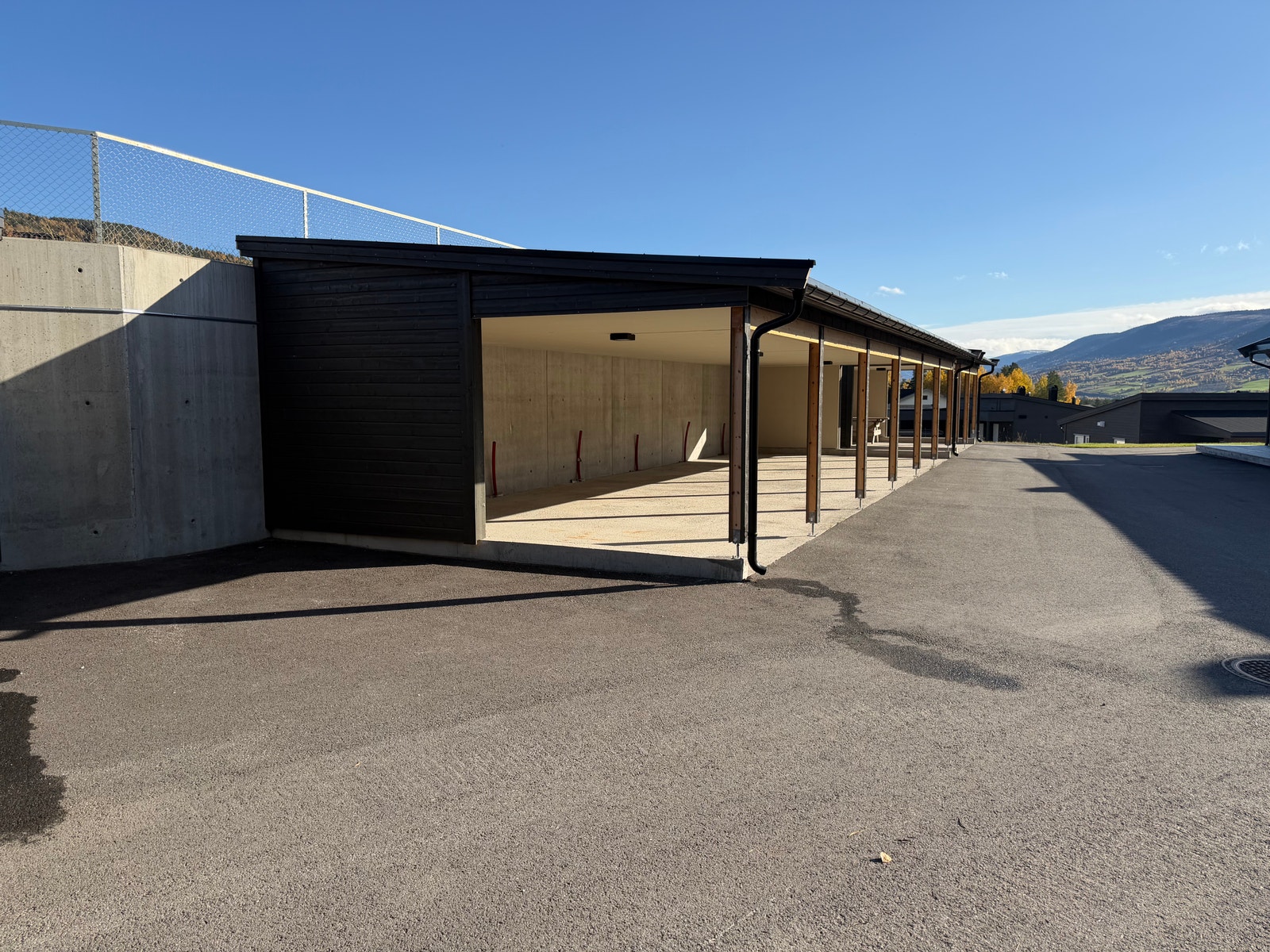 Utvendig carport, sportsbod og felles bygg for håndtering av søppel.