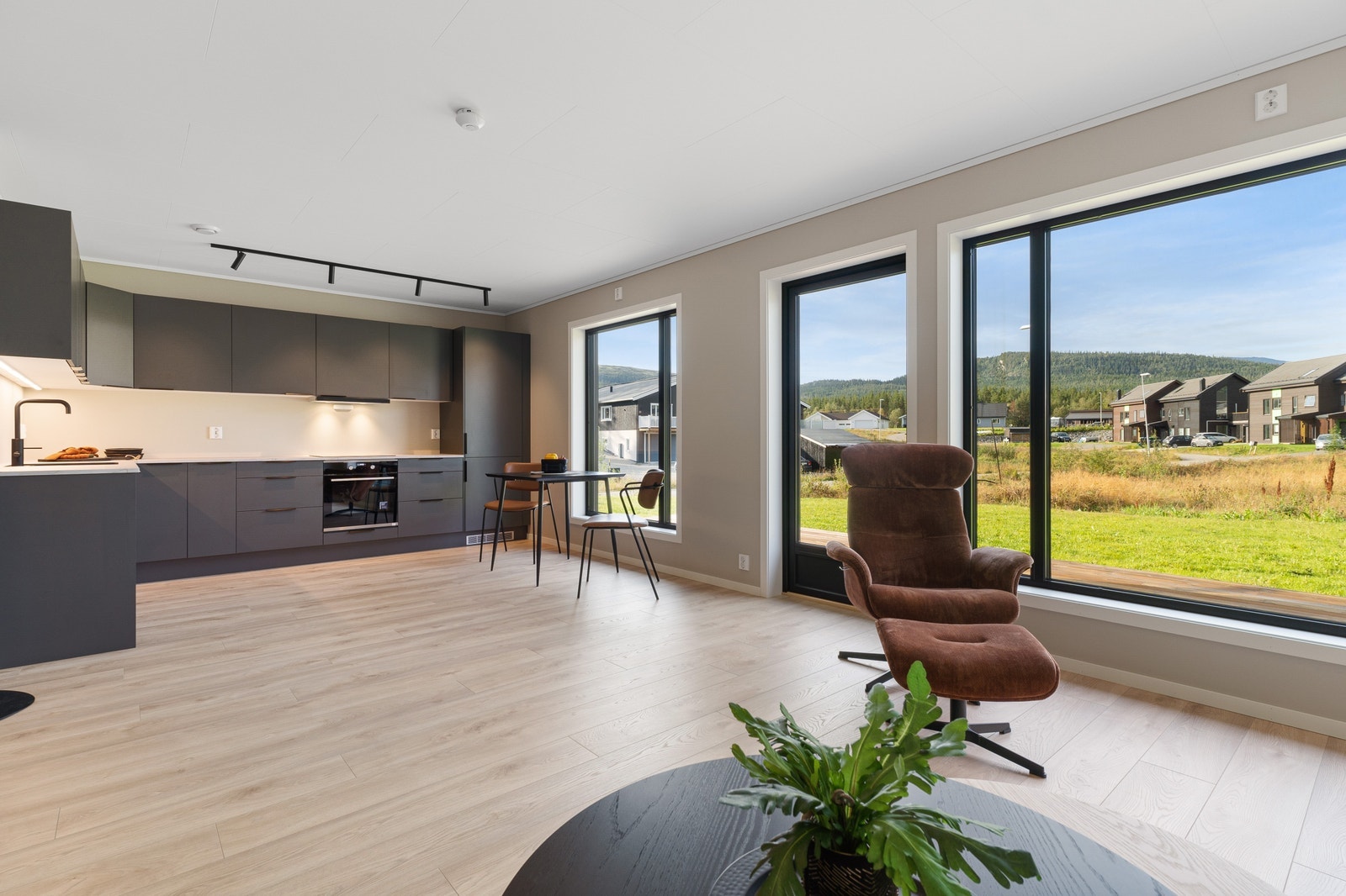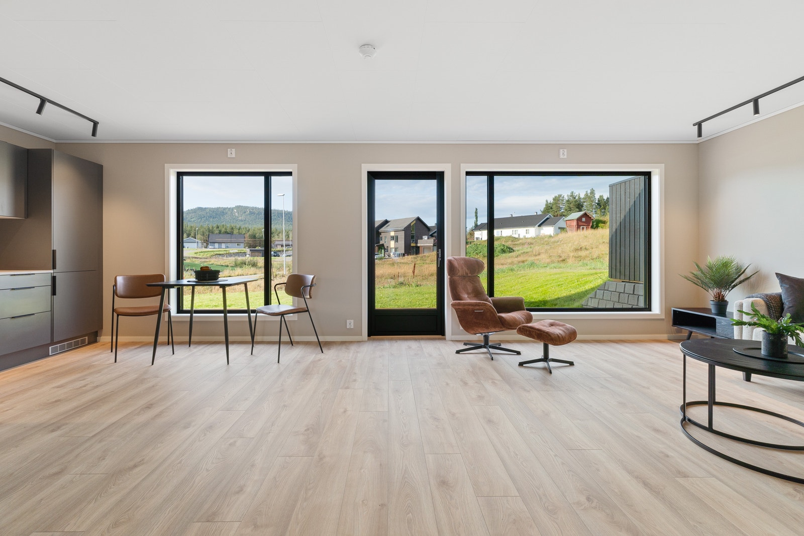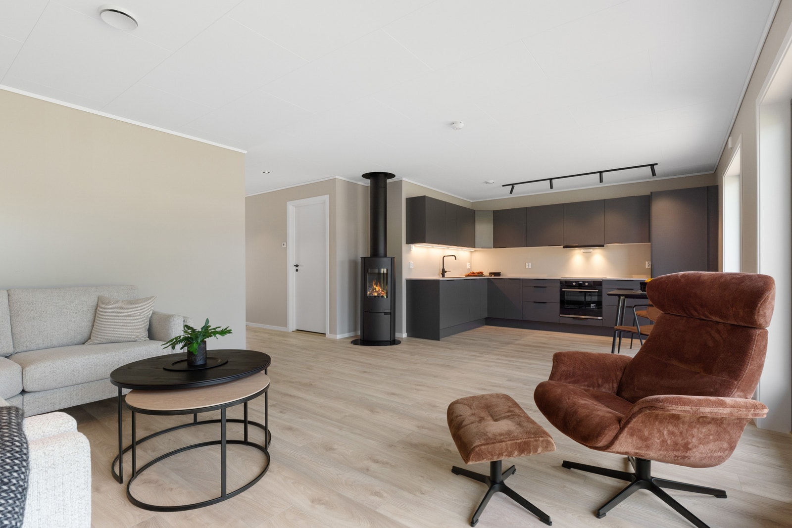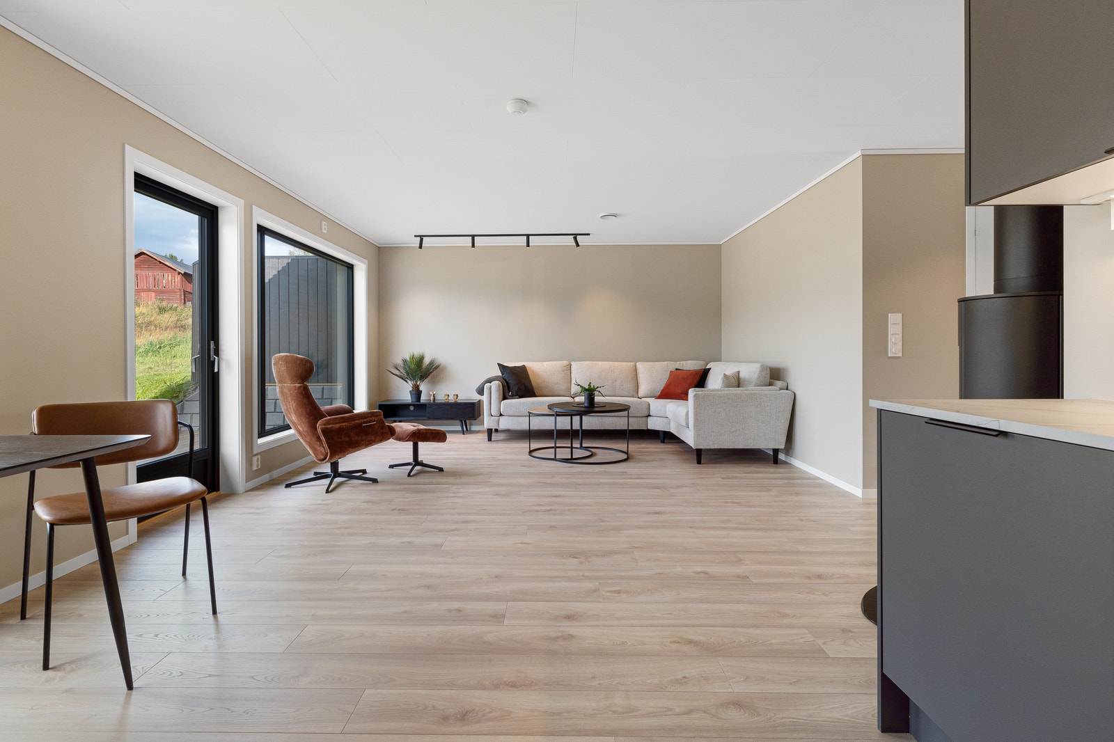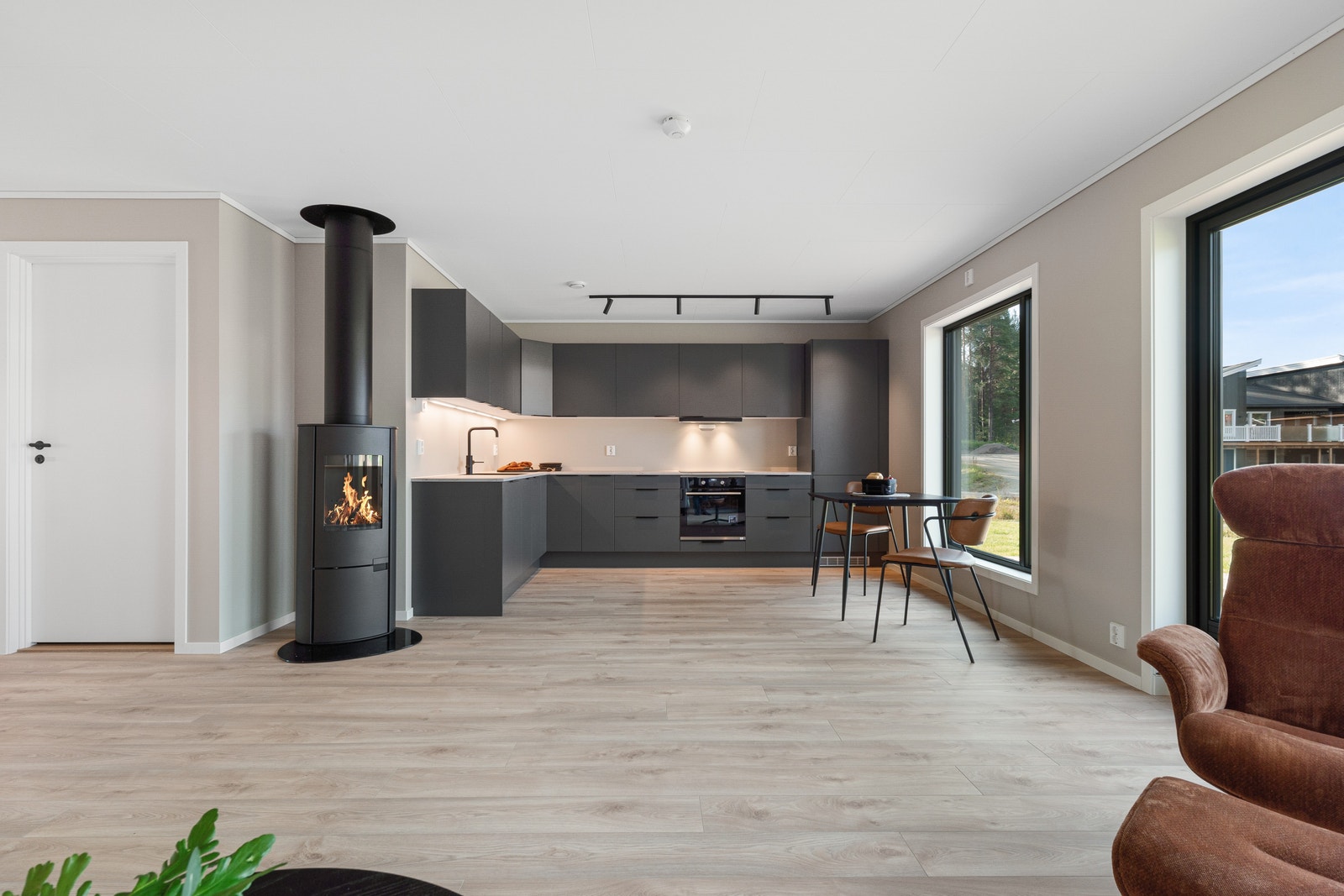 Boligen har en stor, åpen stue/kjøkkenløsning.