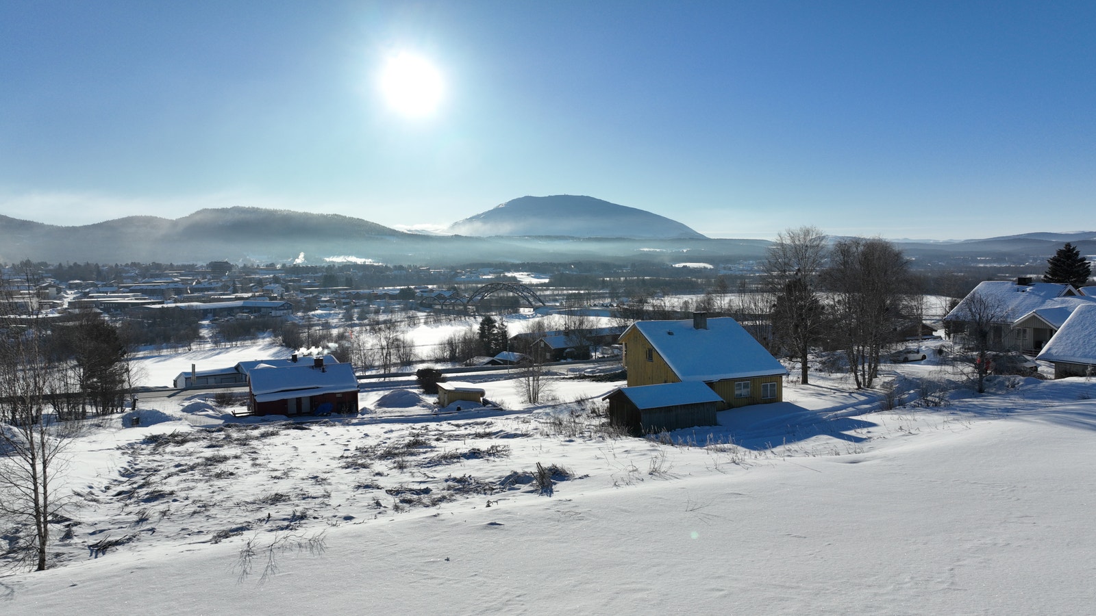 Fra den store veranda på huset, blir det en flott utsikt over Tynset byen, med fjellet Tron i bakgrunnen.