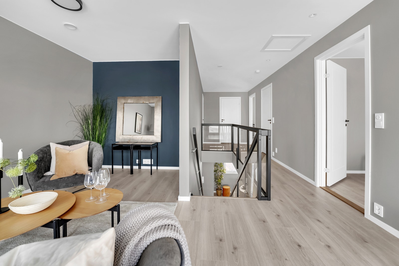 En stilren trapp tar deg opp til 2. etasje, hvor du finner en ekstra stue som er ideell som et sekundært oppholdsrom eller som et sted for å nyte den flotte utsikten. Fra stuen i 2.etg har du utgang til en stor terrasse med flott utsikt mot Mjøsa. Etasjen inneholder også tre soverom, inkludert et hovedsoverom med en hyggelig balkong, et stort bad, og et teknisk rom.
