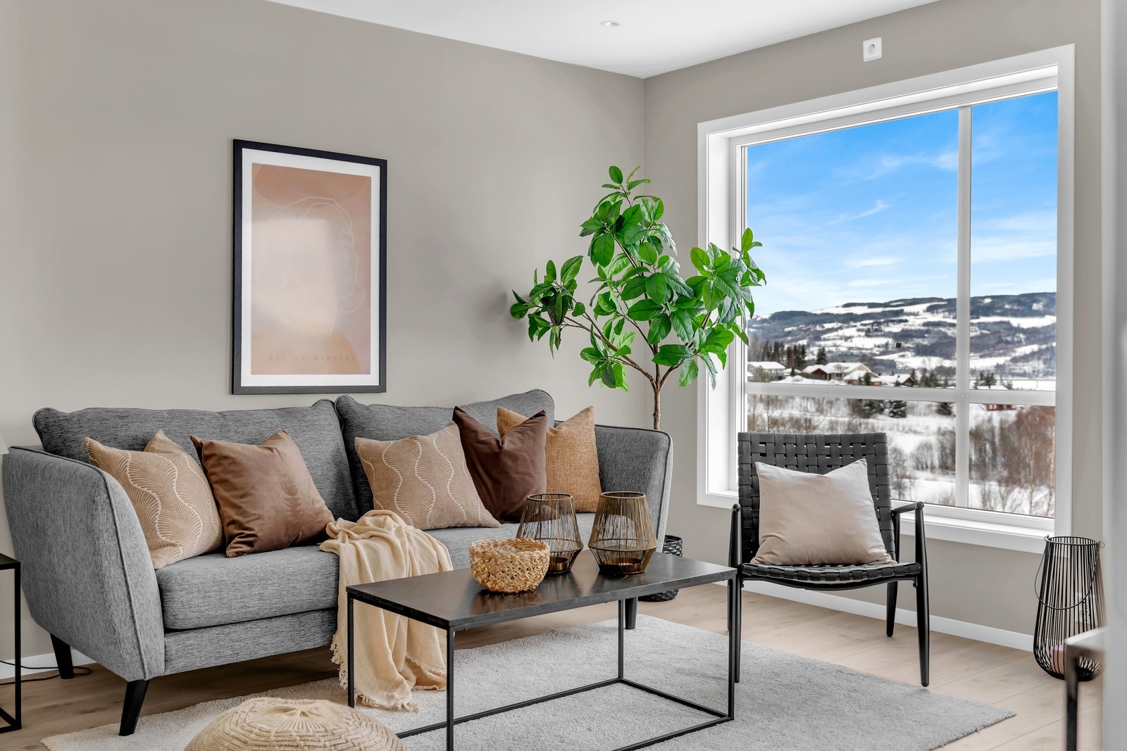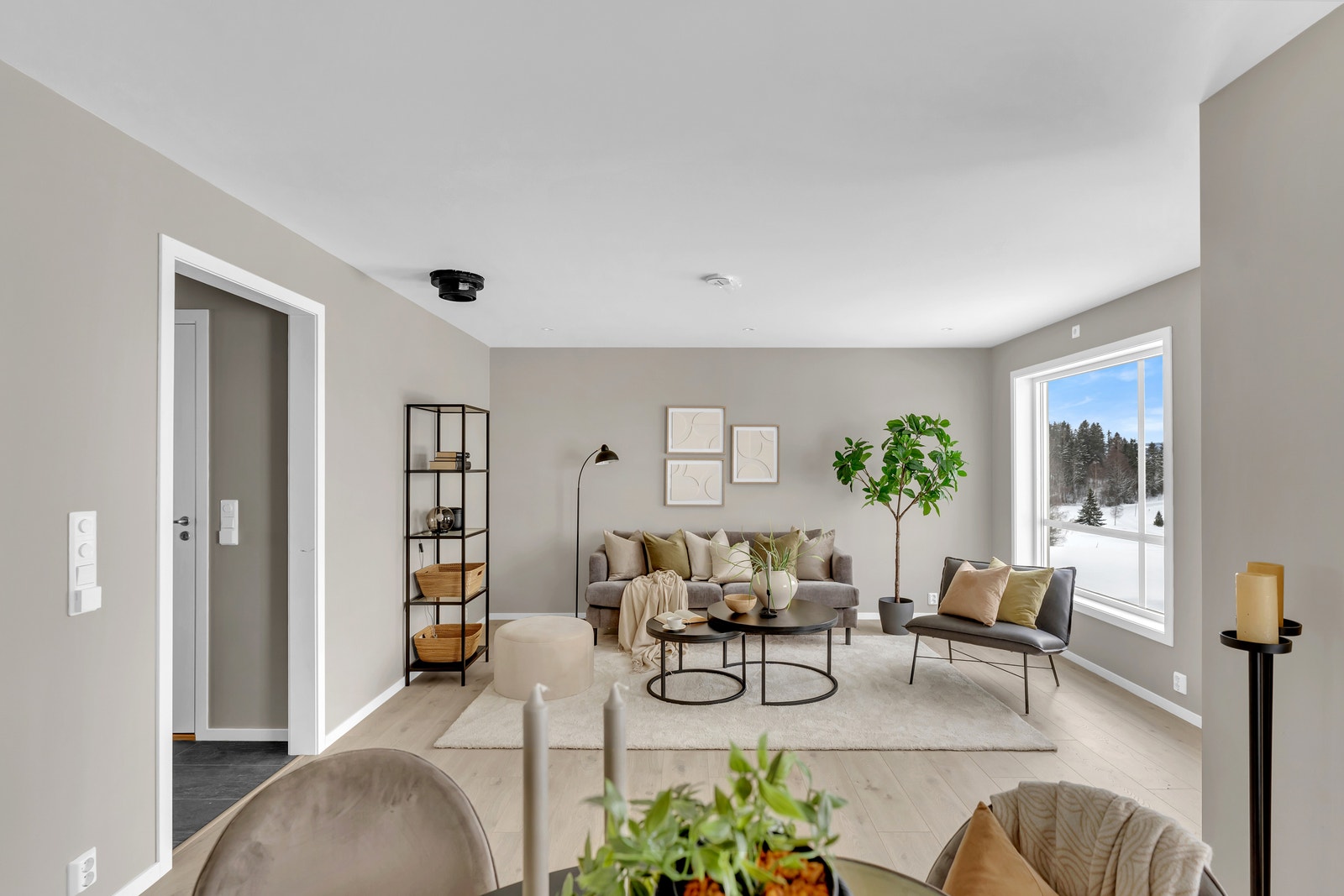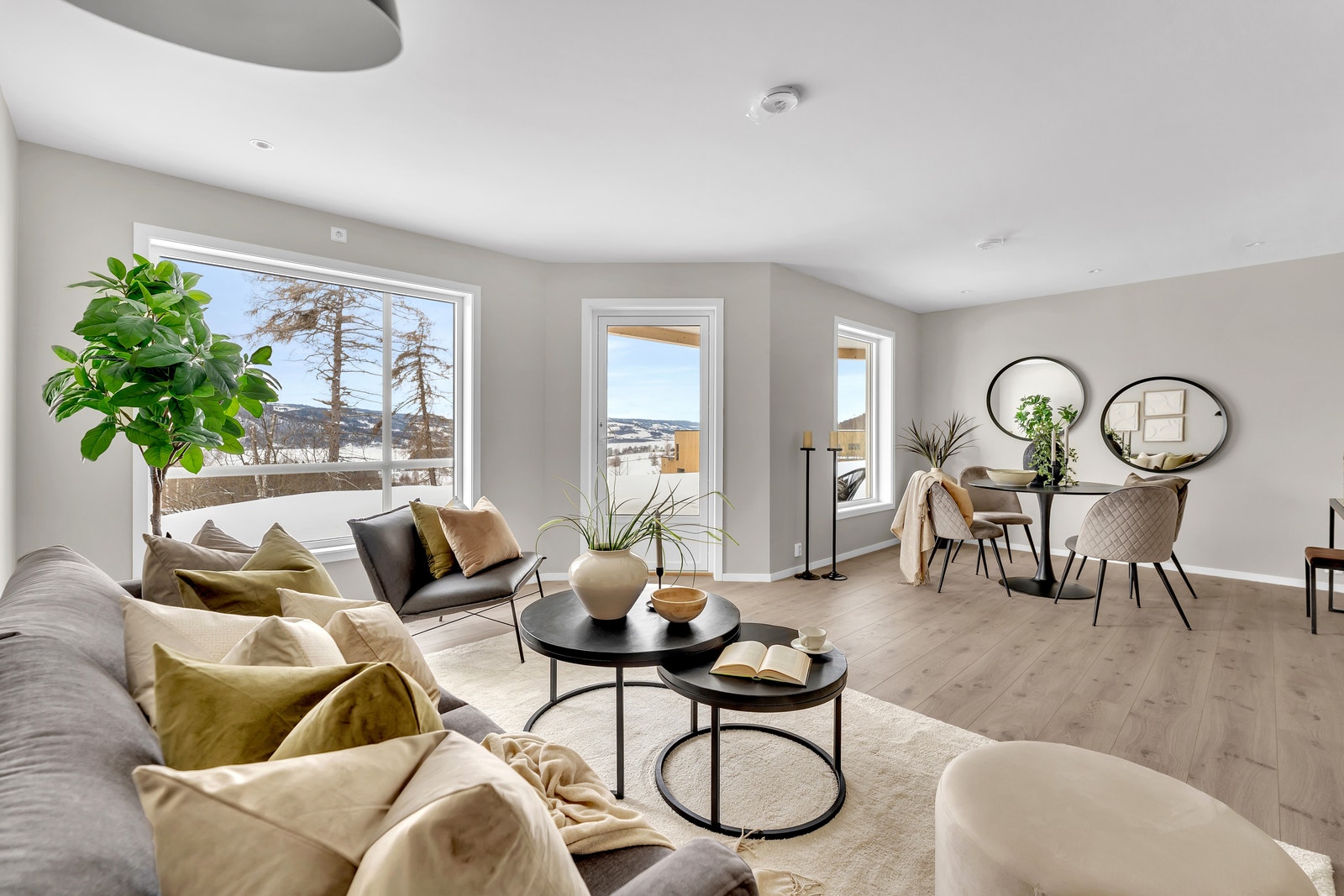 Boligen er ferdigstilt utvendig, men innvendig kan du fortsatt sette ditt eget personlige preg på flere av løsningene.