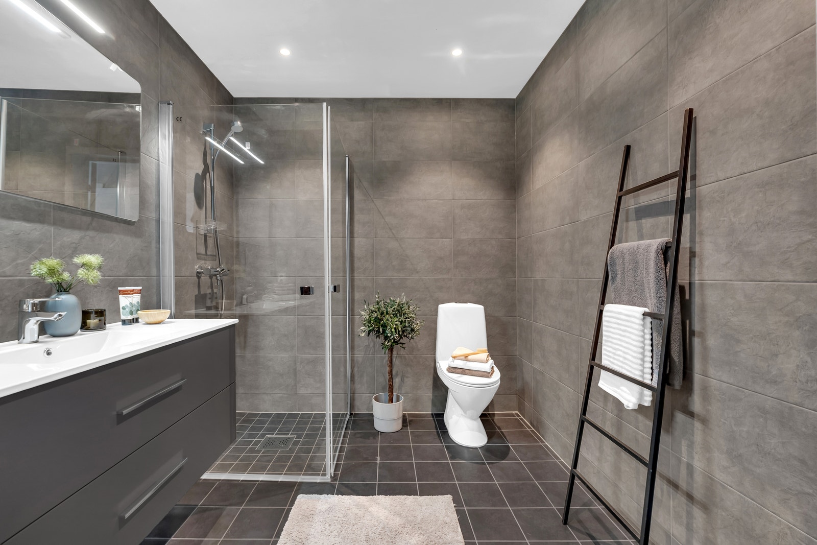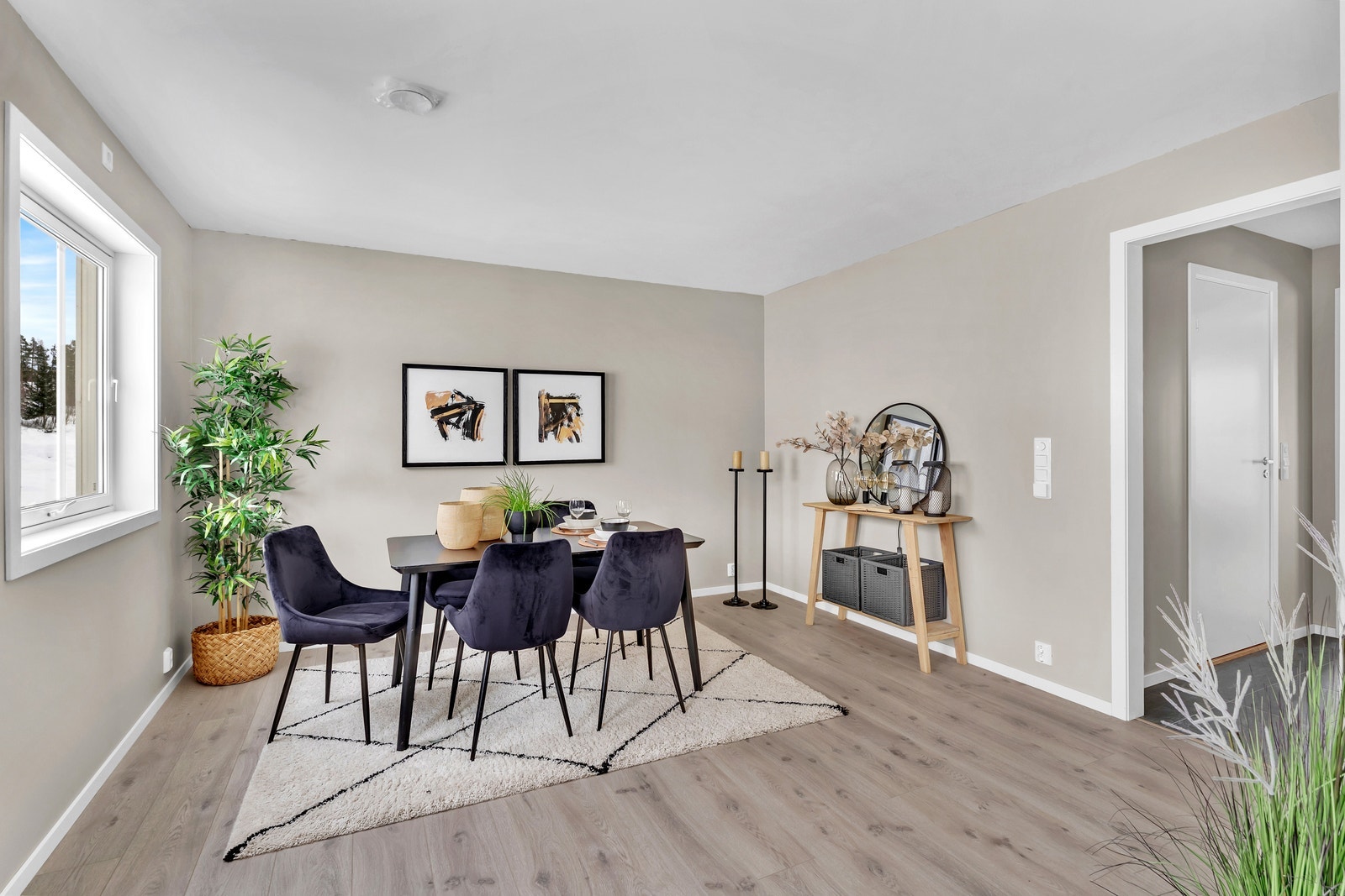 I første etasje finner du også et romslig bad med flislagt gulv/vegger. Stuen er så romslig at den enkelt kan deles inn i to sofakroker – ideelt for både avslapning og sosiale sammenkomster. Fra stuen er det utgang til terrassen på bakkeplan, som gir deg direkte tilgang til hagen og en plass å sitte under tak når temperaturen er god, men været ikke samarbeider.