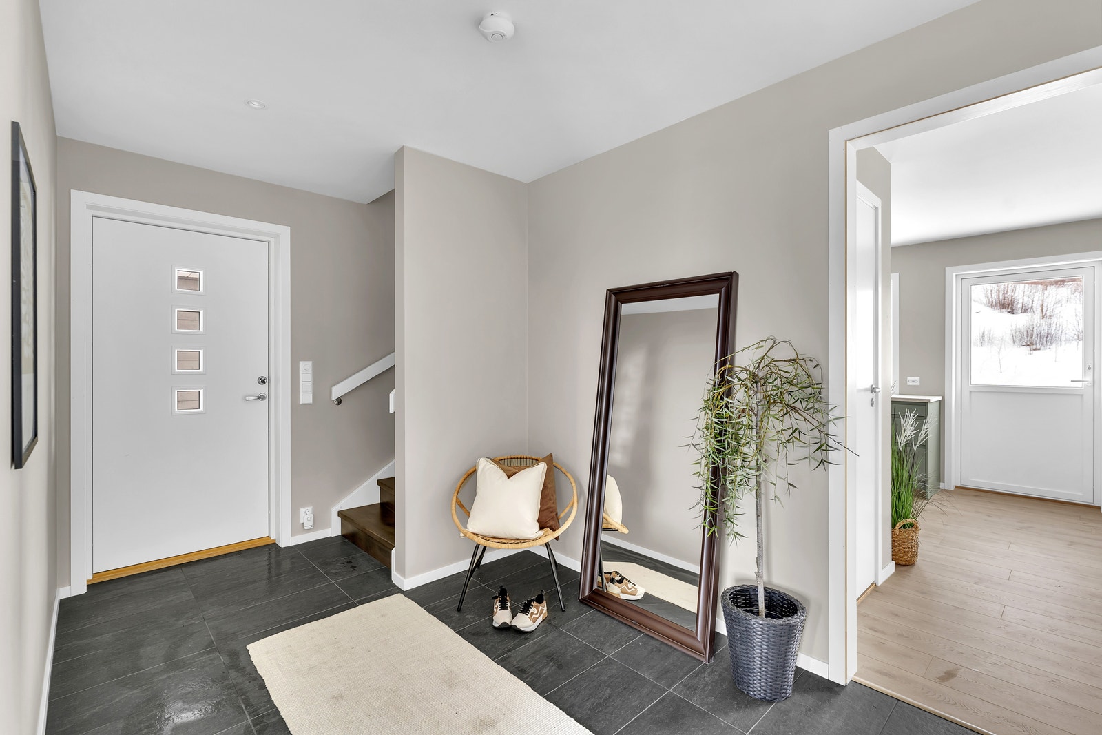 Denne flotte boligen har alt du trenger for et komfortabelt og praktisk liv, fordelt over to etasjer. Når du trer inn i første etasje, møtes du av en romslig, flislagt gang med god plass til garderobe. Fra gangen kan du velge å gå opp til andre etasje eller videre inn til det store, moderne kjøkkenet fra Sigdal, som er utstyrt med integrerte hvitevarer. Kjøkkenet har stor plass til et spisebord hvor mange gjester kan samles, og utgang til en liten platting, perfekt for morgenkaffen.