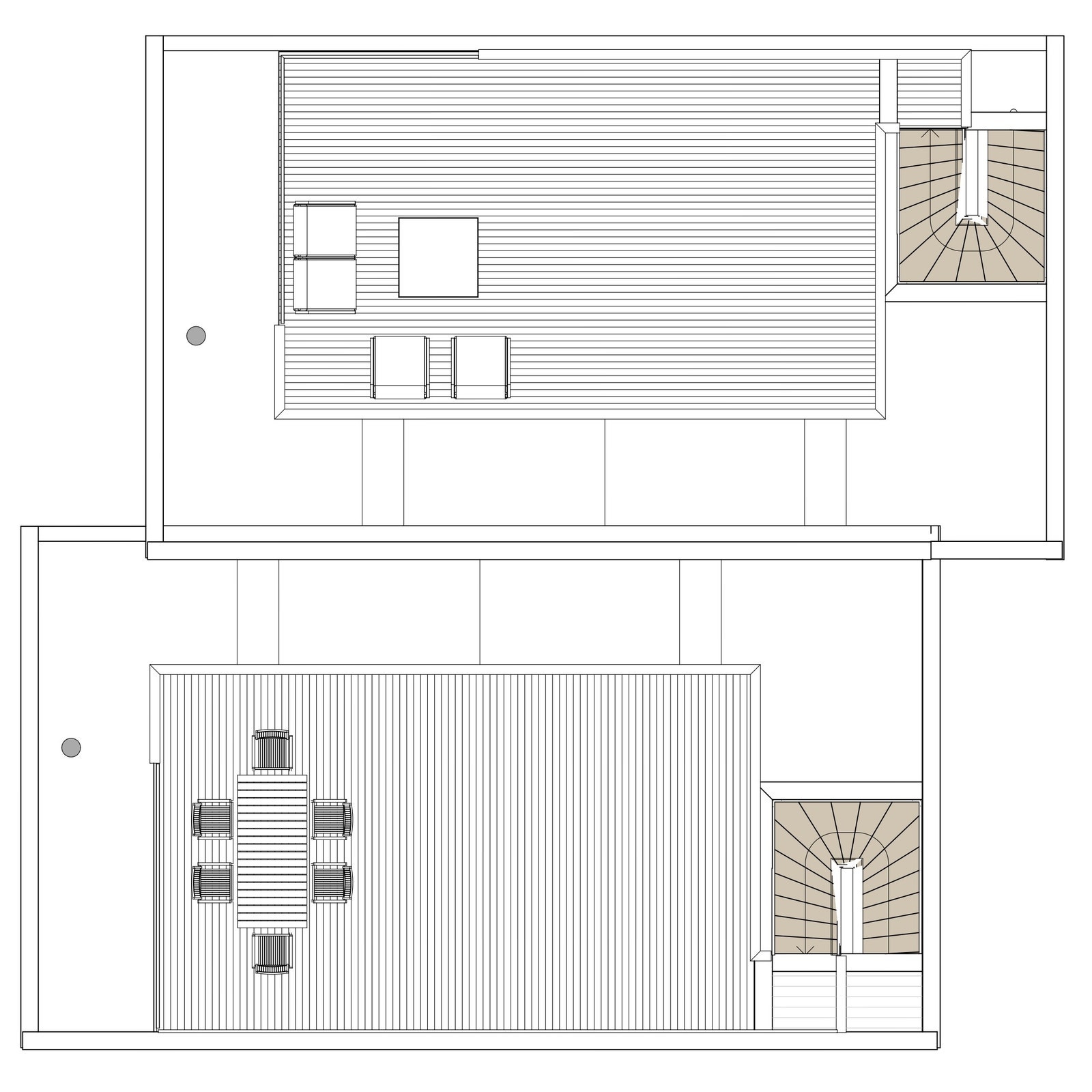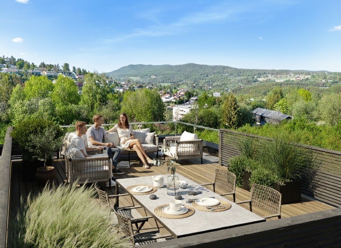 Stue- og kjøkkendelen har ekstra takhøyde og store vindusflater, som gir en lys og luftig atmosfære. Herfra har du utgang til en solrik terrasse på 22 m², som videre leder opp til en privat takterrasse på 23 m² – perfekt for både hverdager og sosiale anledninger.