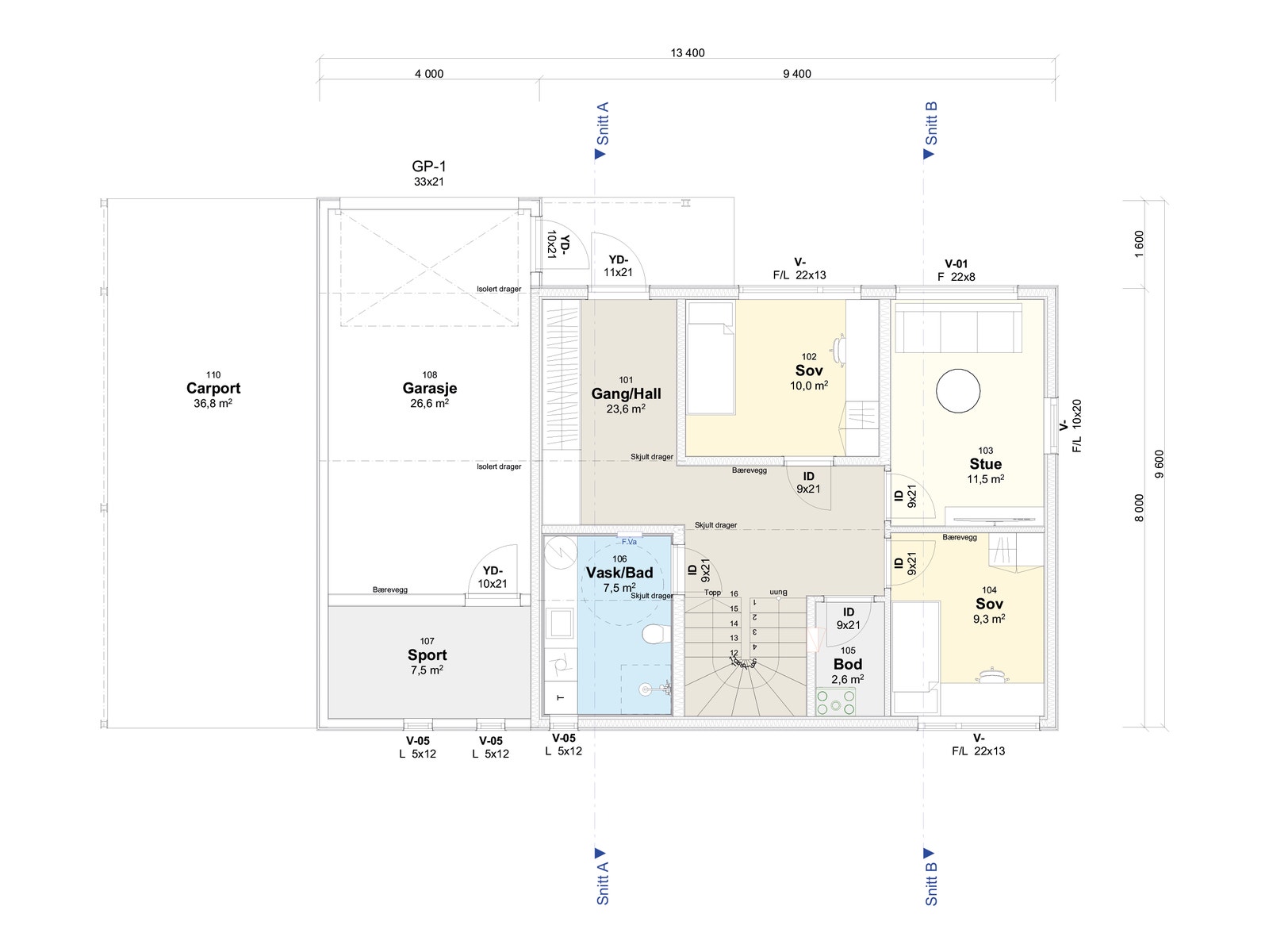- Ferdigmalte veggplater i stue (1. etasje), soverom, bod og garderobe