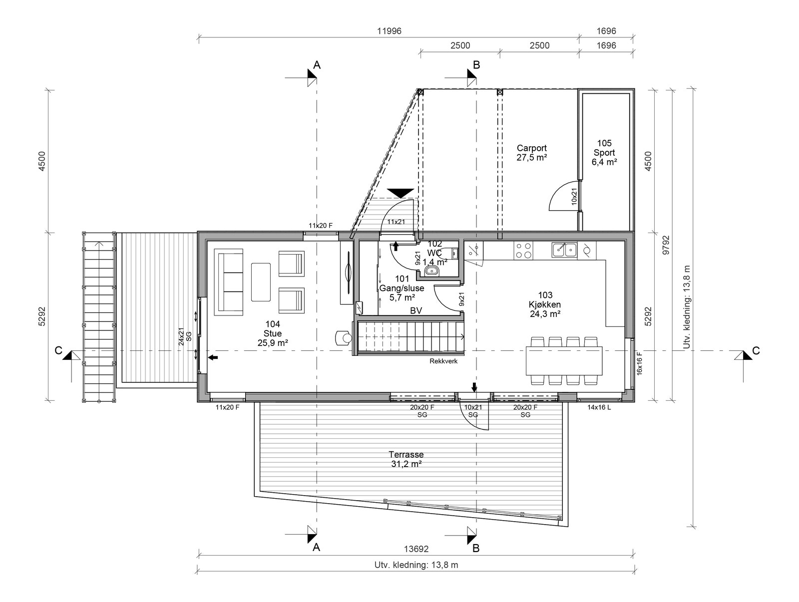 Ute har du to terrasser, samt sportsbod både nede og oppe i forbindelse med carporten.