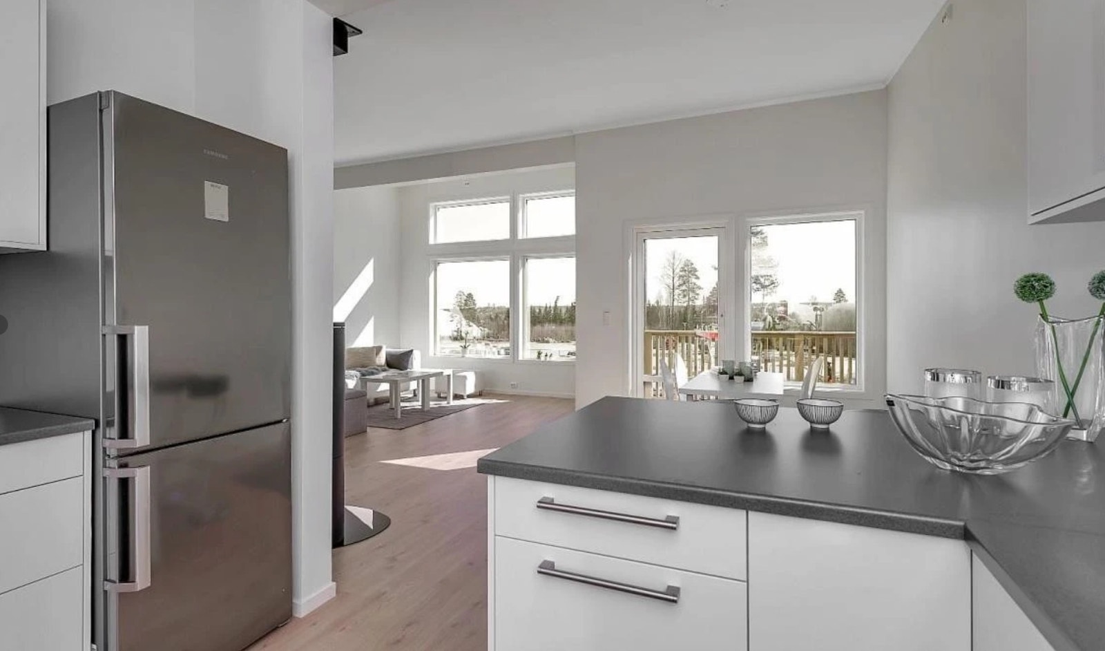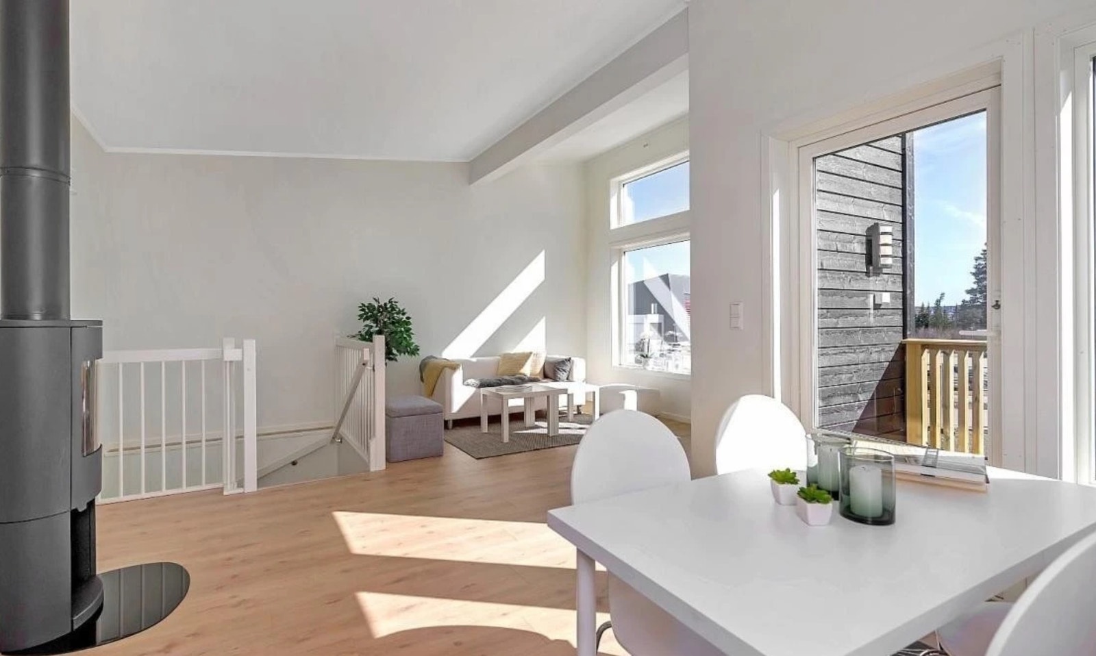 Store vindusflater og ekstra takhøyde sørger for lyse og trivelige oppholdsrom. Det er åpen løsning og flott gjennomlys mellom stue og kjøkken, og kjøkkenets plassering gjør at det likevel ligger noe