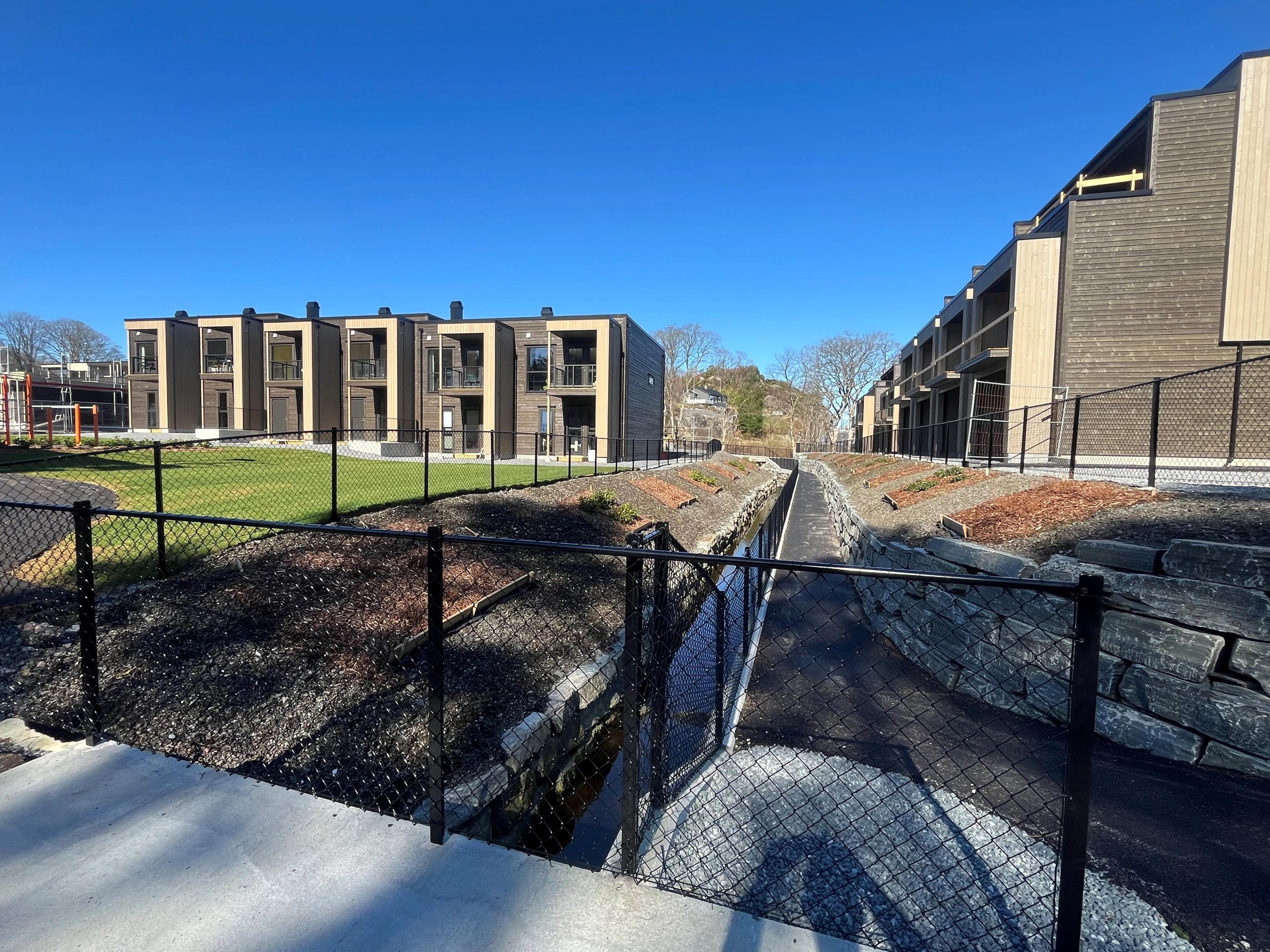 Det vil være harmoniske uterom mellom byggene og lekeplasser plassert på solrike områder. Eksisterende bekk gjennom området blir beholdt og tilrettelagt for boligområdet. I grense mot sør blir det laget et vannspeil sammen med uteområdet og en gapahuk. Bekk og areal ned mot denne blir bygget opp som skisser på utenomhusplan.