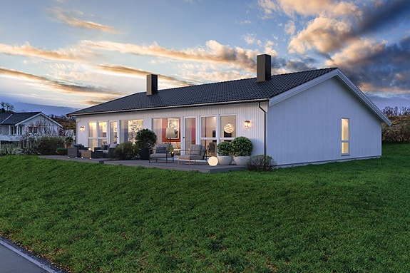 Flott enebolig med tre soverom og alt på en flate, carport og overbygget terrasse til salgs på prospekt i Geithus Modum